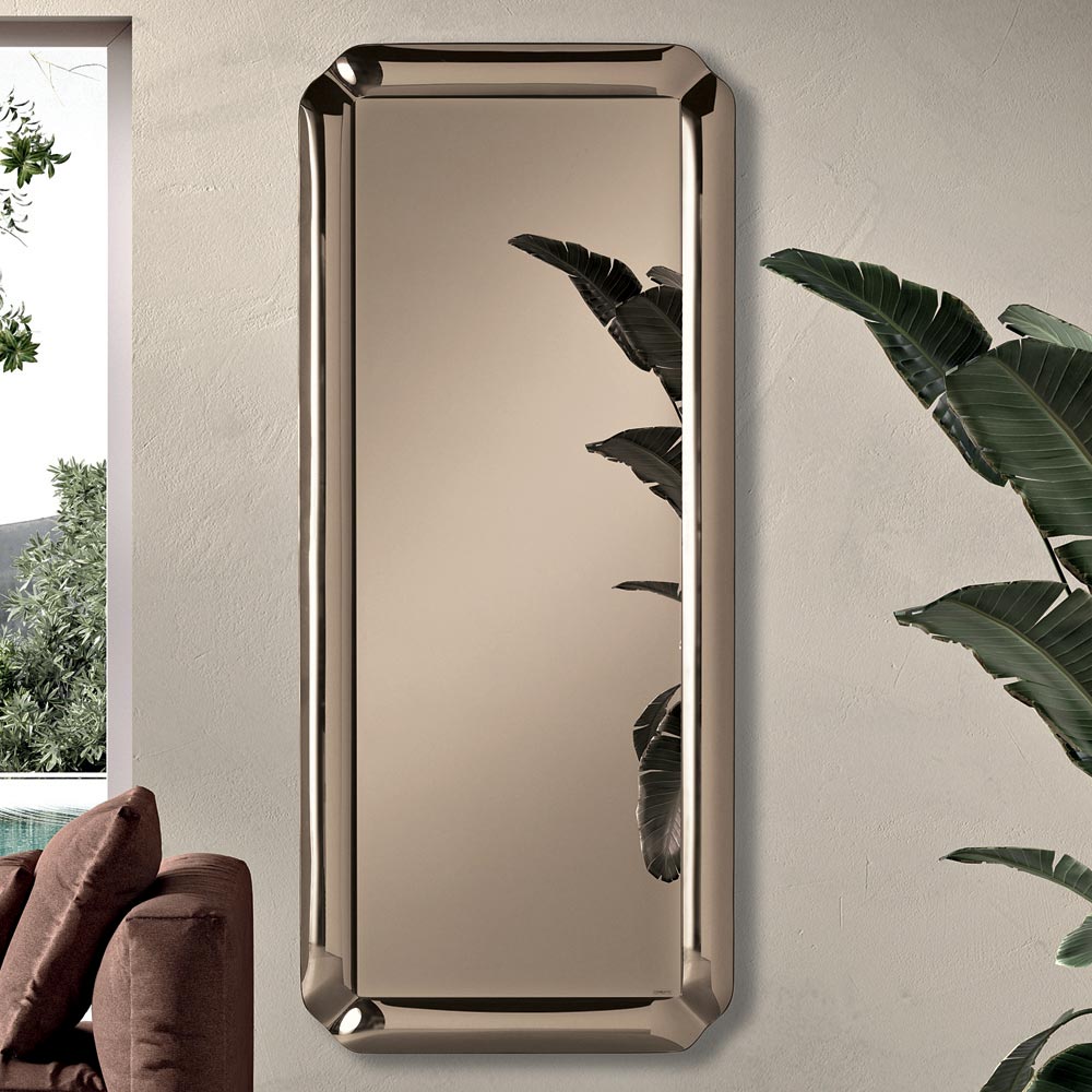 Zrcadlo má obdélníkový tvar zdobený rámem z litého křišťálu tón v tónu s jemně tvarovanými rohy . Reflexní deska spočívá na rámu a vytváří rafinovanou hru hloubky , která zvýrazňuje povrch a dodává kompozici lehkost.