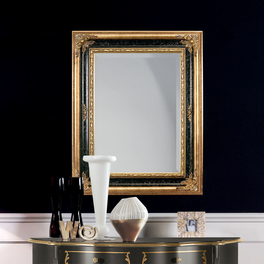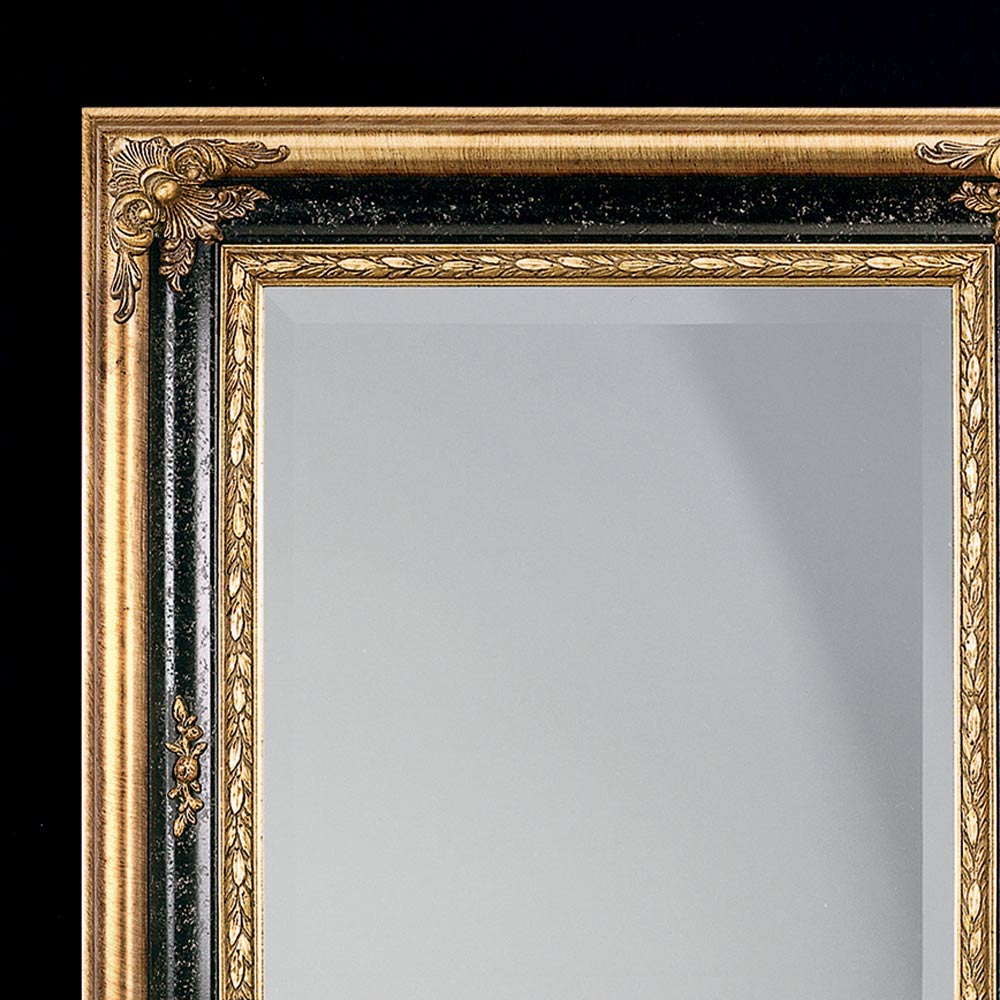 Elegantní obdélníkové zrcadlo s dřevěným rámem zdobeným plátkovým zlatem a černým lakem. Díky svému klasickému stylu je toto zrcadlo ideální pro dodání elegantního a luxusního nádechu každé místnosti.