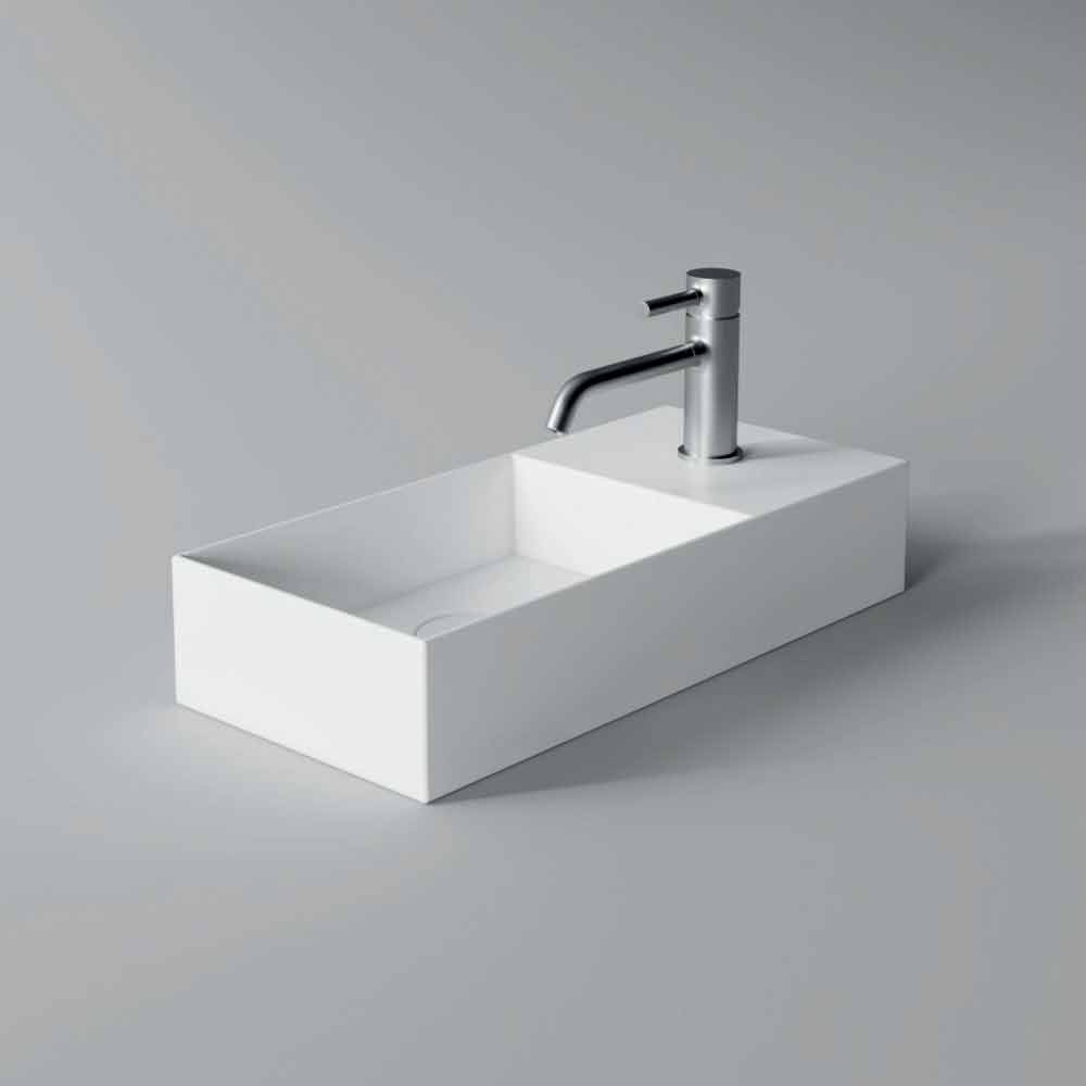 Obdélníkové umyvadlo s moderním designem v keramické, na desku nebo závěsné instalaci, vyrobené v Itálii.