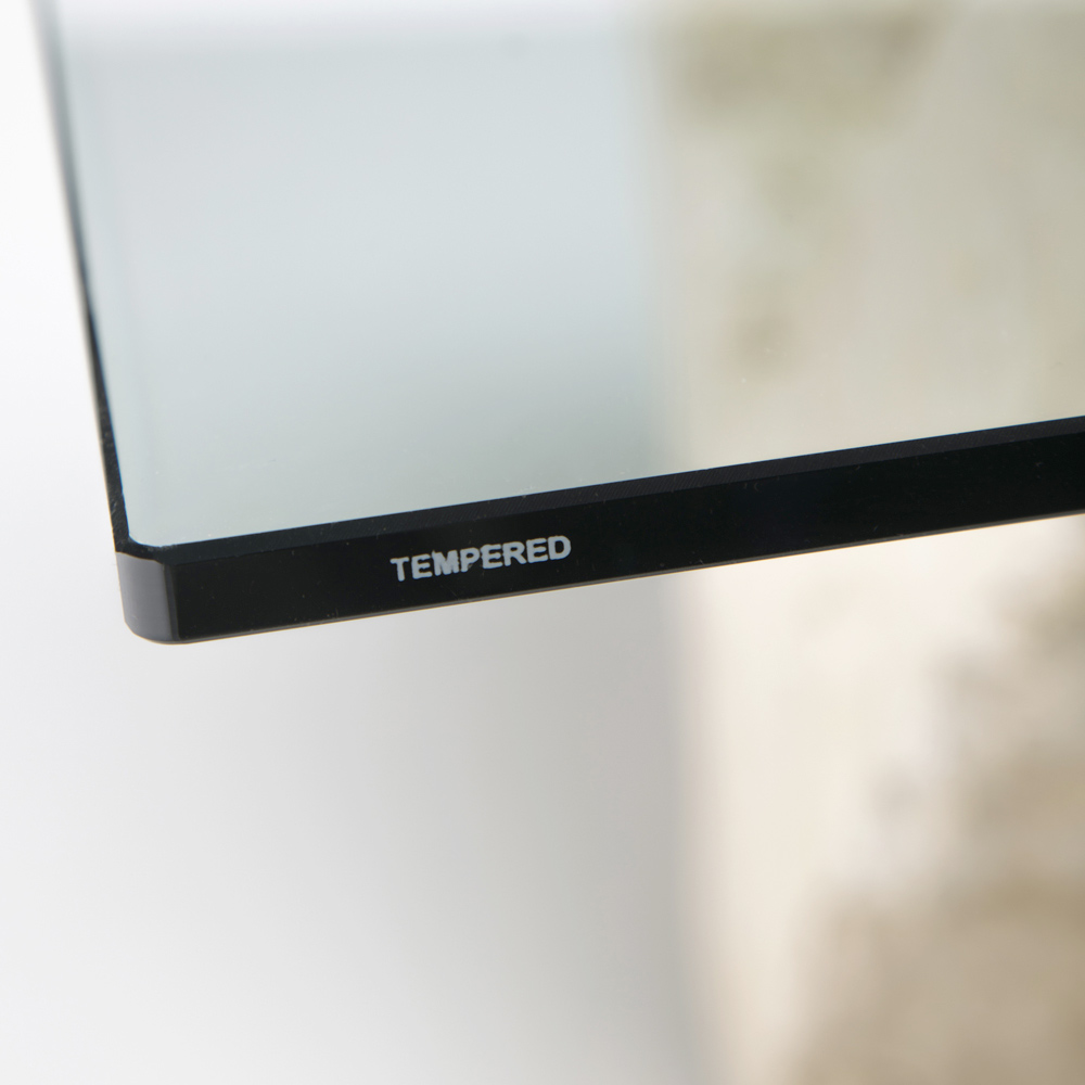 Konferenční stolek se strukturou bílého fosilního kamene a 10 mm leštěnou skleněnou deskou.