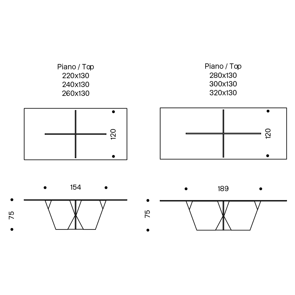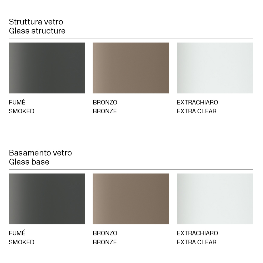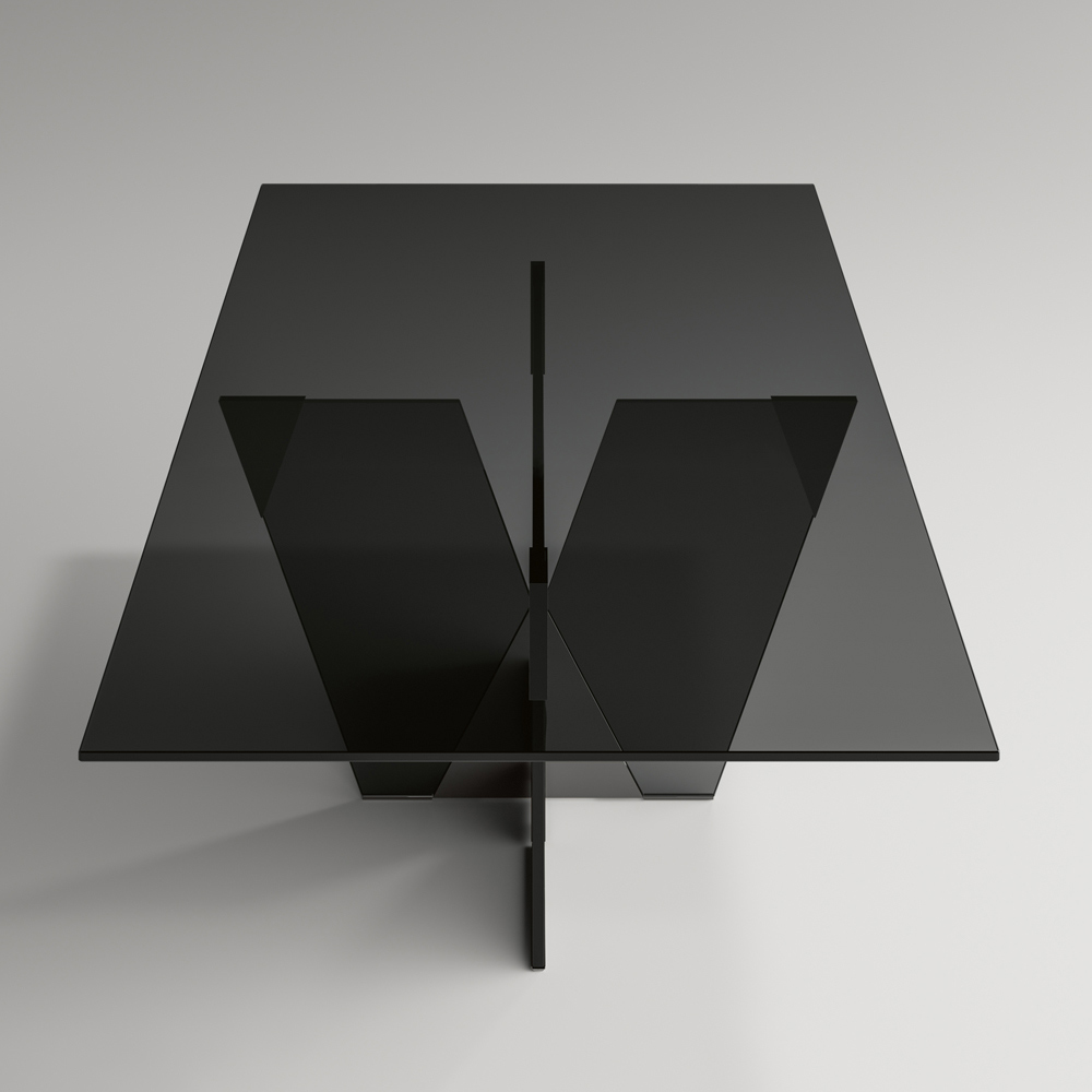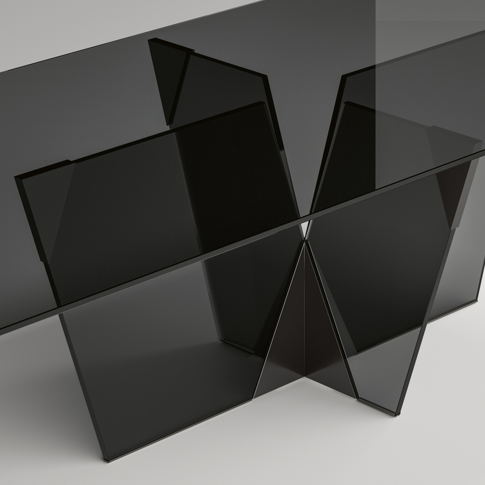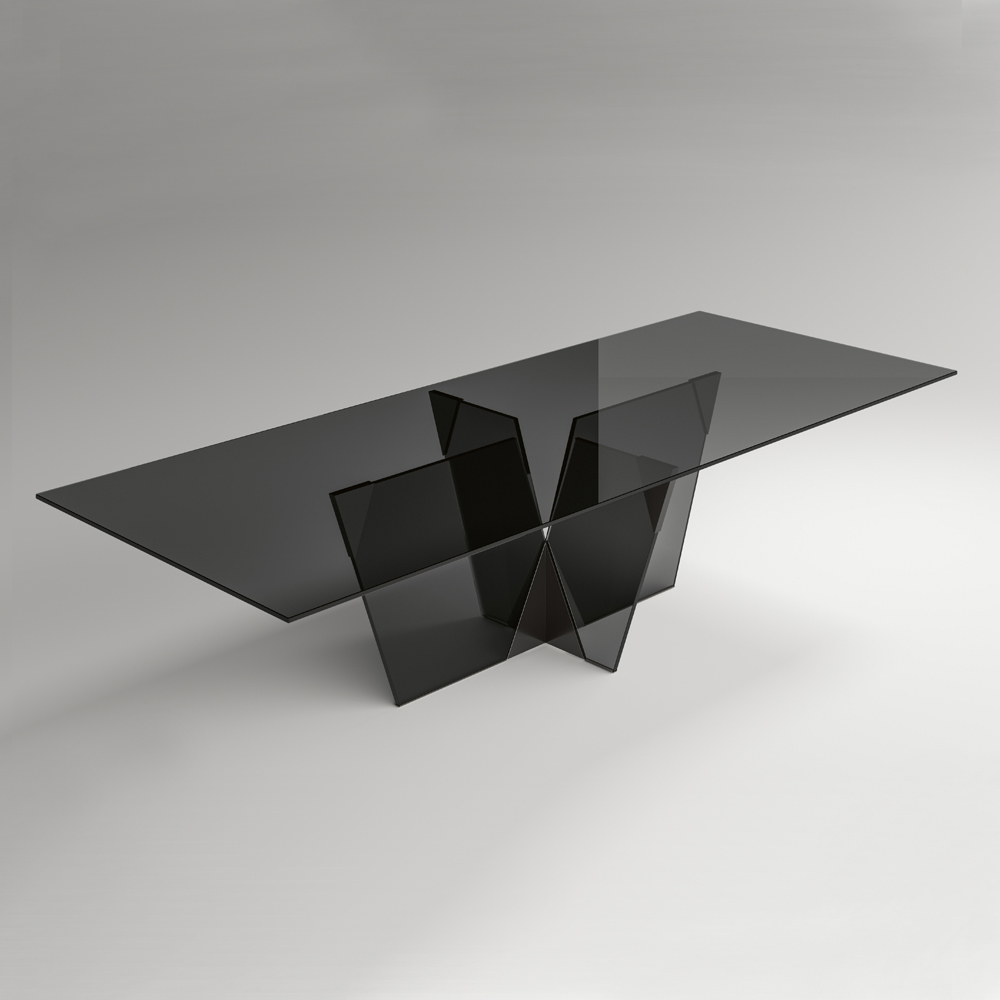 Tento kus nábytku, který se vyznačuje elegantní a sochařskou strukturou , se rodí z kombinace materiálů různé povahy spolu s vášní pro zpracování skla, čímž se mu podařilo definovat reprezentaci síly a charakteru prostřednictvím různých tvarů a tlouštěk. Silnou stránkou jeho estetiky je architektonický základ charakterizovaný pyramidovým spojem z kovu, který tvoří podstatnou část produktu. Kovové prvky dotvářejí design stolu, dávají tvar sklu podnože a obohacují jej o osobitost a originalitu.