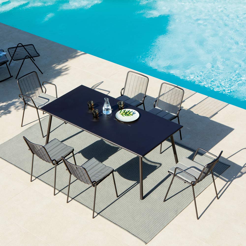 Zahradní stůl s pozinkovanou ocelovou konstrukcí vyrobený italskými řemeslníky, kteří mu dodávají 100% kvalitu „Vyrobeno v Itálii“ . Tento bytový doplněk je vyroben z materiálů určených pro vysokou odolnost vůči atmosférickým vlivům a korozivním látkám. Jeho design je moderní a zároveň propracovaný ve své praktičnosti a funkčnosti . Harmonické a vyvážené proporce ladí s jeho střízlivými a elegantními barvami.