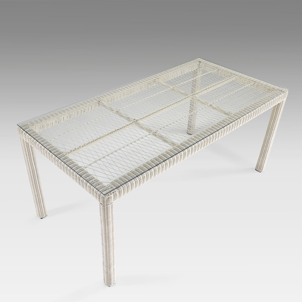Obdélníkový venkovní jídelní stůl Gigi má konstrukci s rámem vyrobeným z práškově lakovaného hliníku , na kterém je ručně tkané vlákno Polyrattan značky Rehau o síle 3 mm. Kromě toho je stůl vybaven skleněnou deskou o tloušťce 8 mm , která nechává vyniknout ručně tkané rozetě.