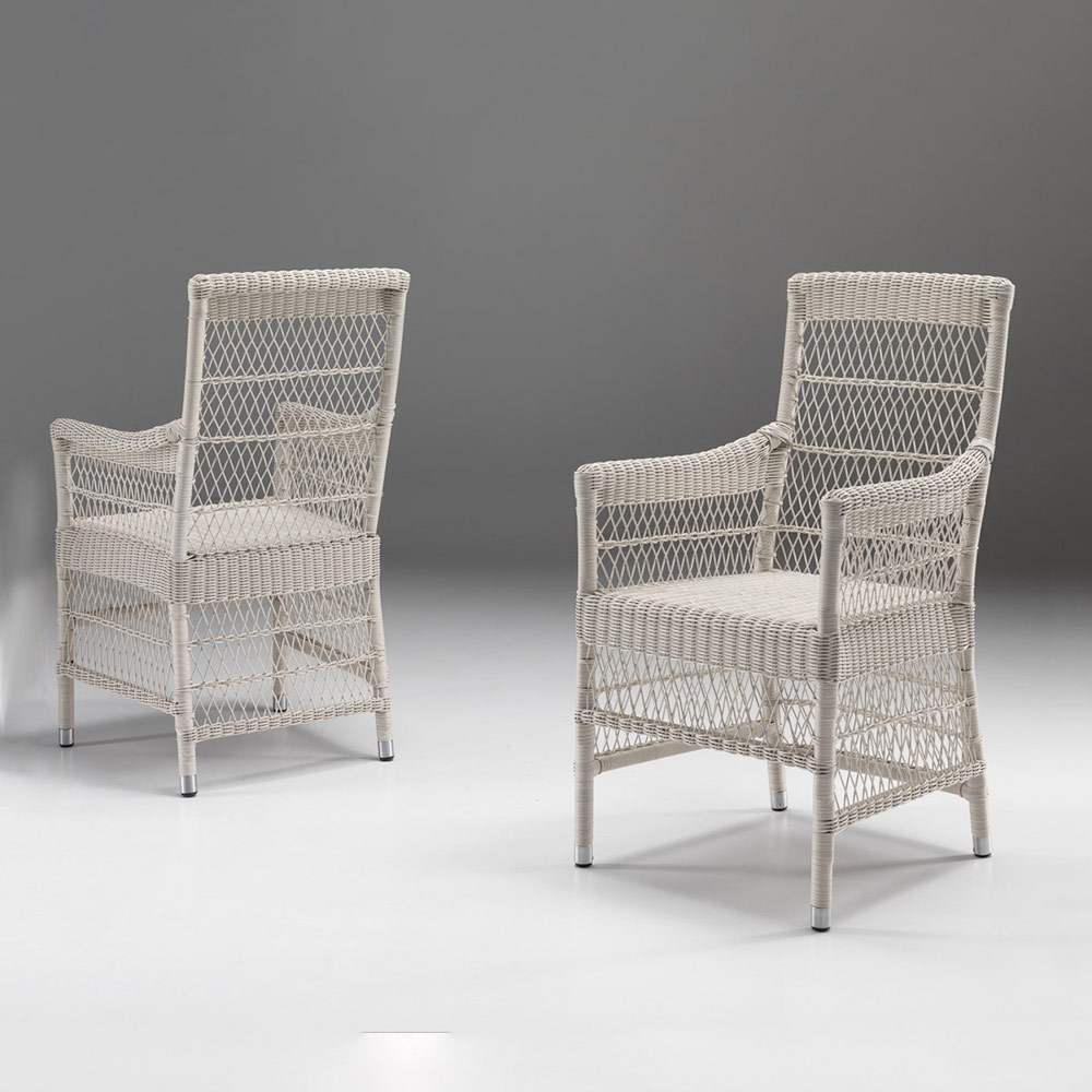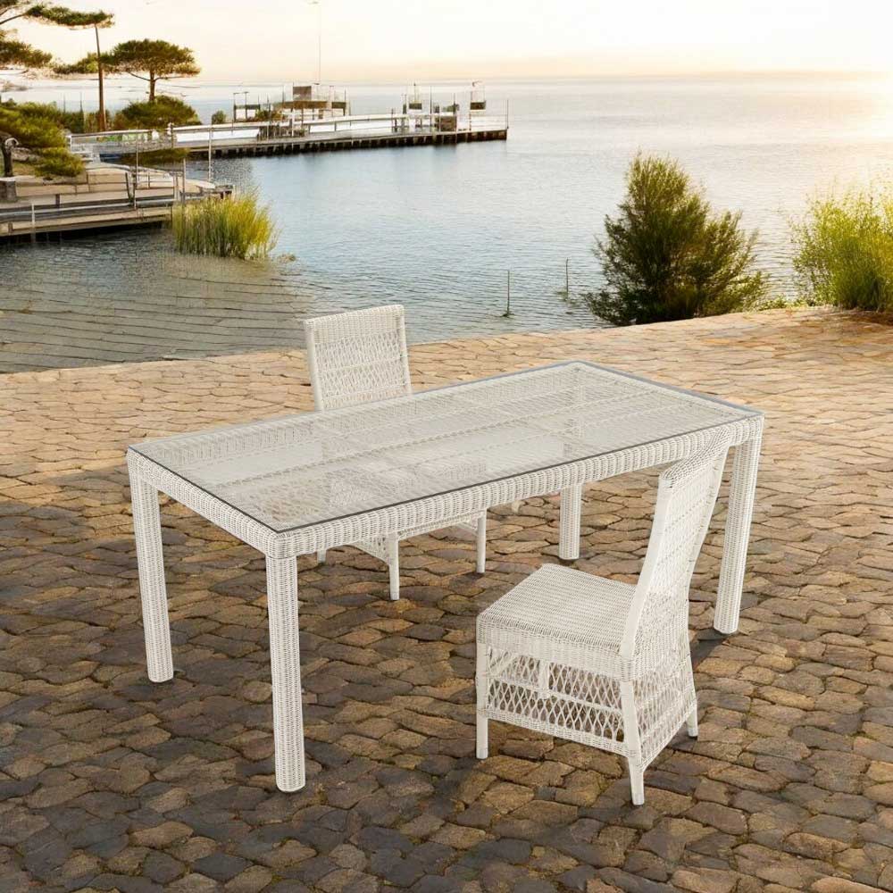 skleněnou deskou, 4 židlí a 2 křesel s područkami s hliníkovým rámem a výpletem z polyratanu značky REHAU. Tato kompozice se vyznačuje výrazným