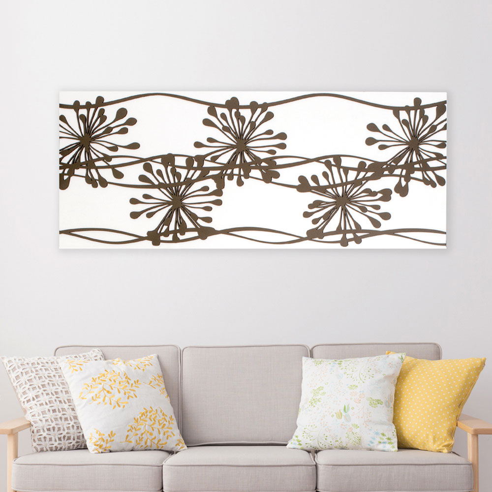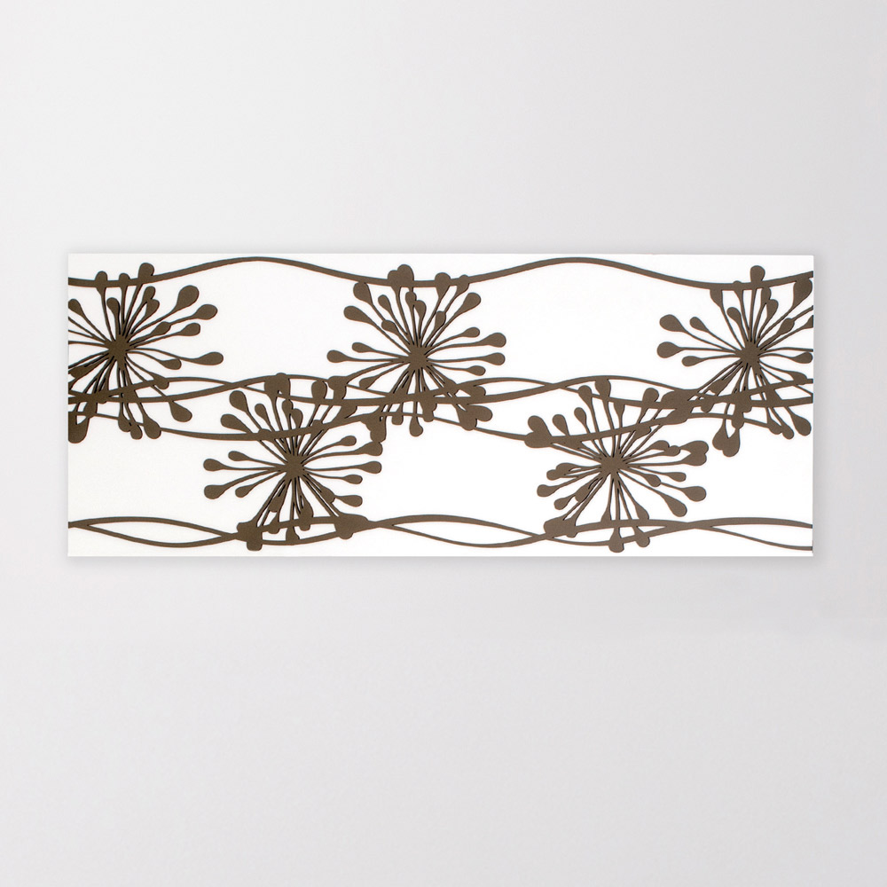 Abstraktní panel pro elegantní dekoraci, vyrobený na bíle lakovaném dřevě s holubičí šedou lakovanou dekorací sasanek .