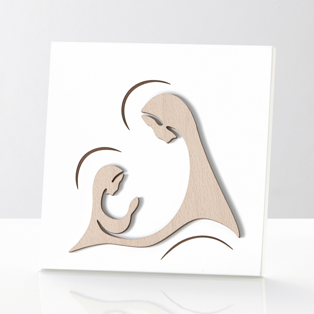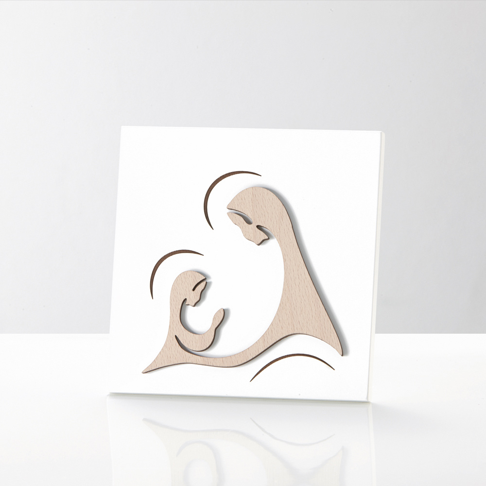 Posvátný obraz znázorňující zjevení Madony v přírodním dřevě a laserové gravírování. Bílý lakovaný dřevěný panel s opěrnou nohou a otvorem pro zavěšení na zeď.