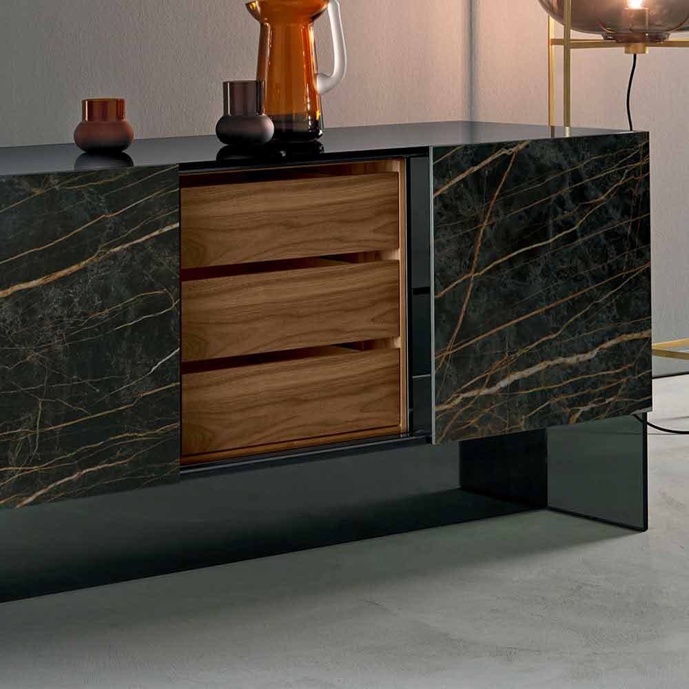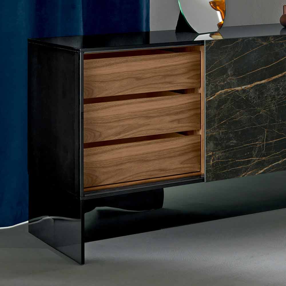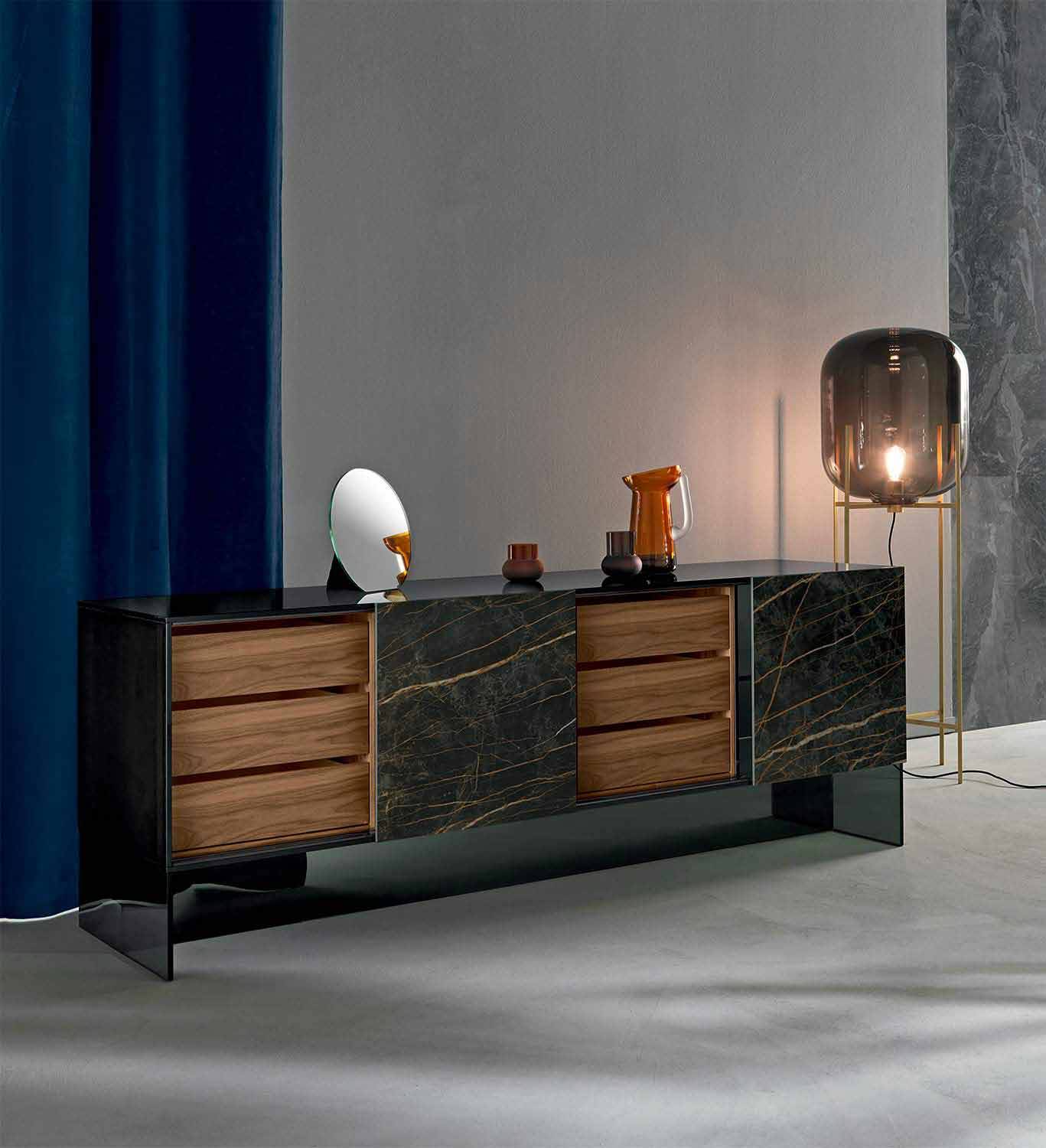 Příborník obývacího pokoje s kouřovou skleněnou strukturou a dvěma lesklými keramickými dveřmi Noir Desir, realizovanými ručně v Itálii.