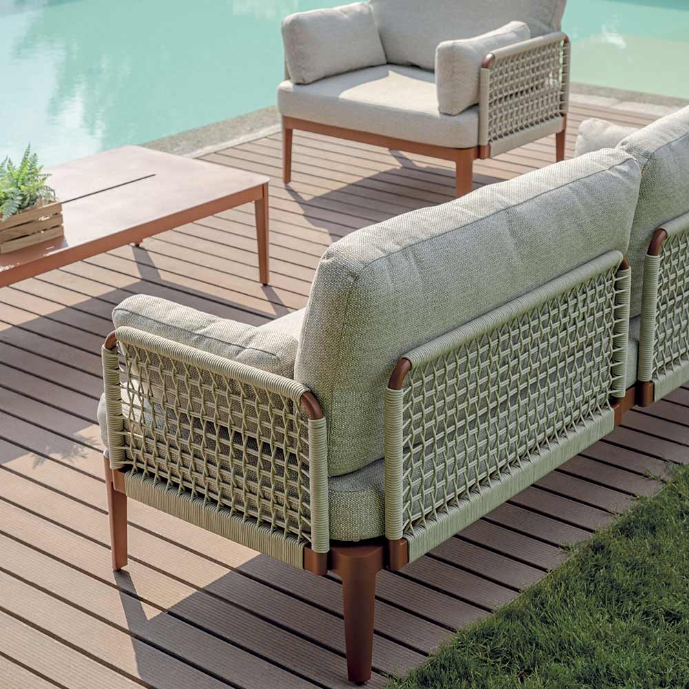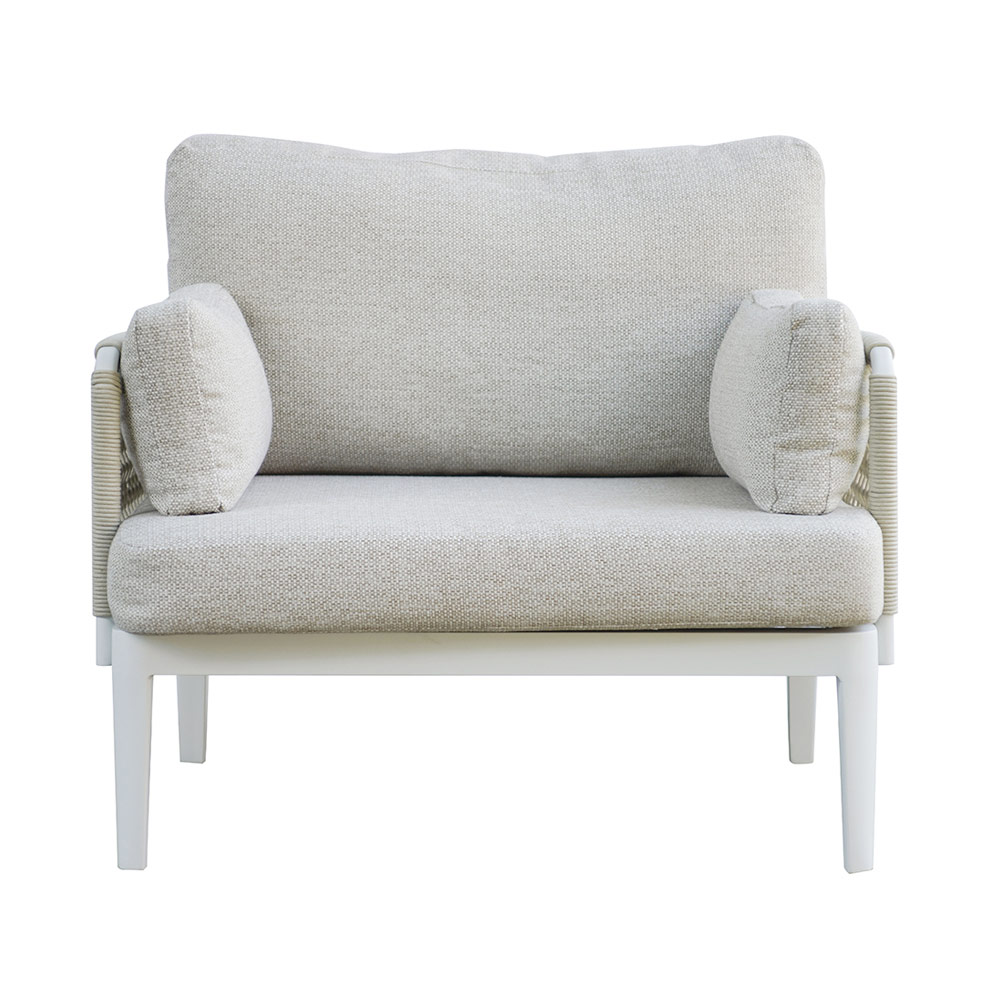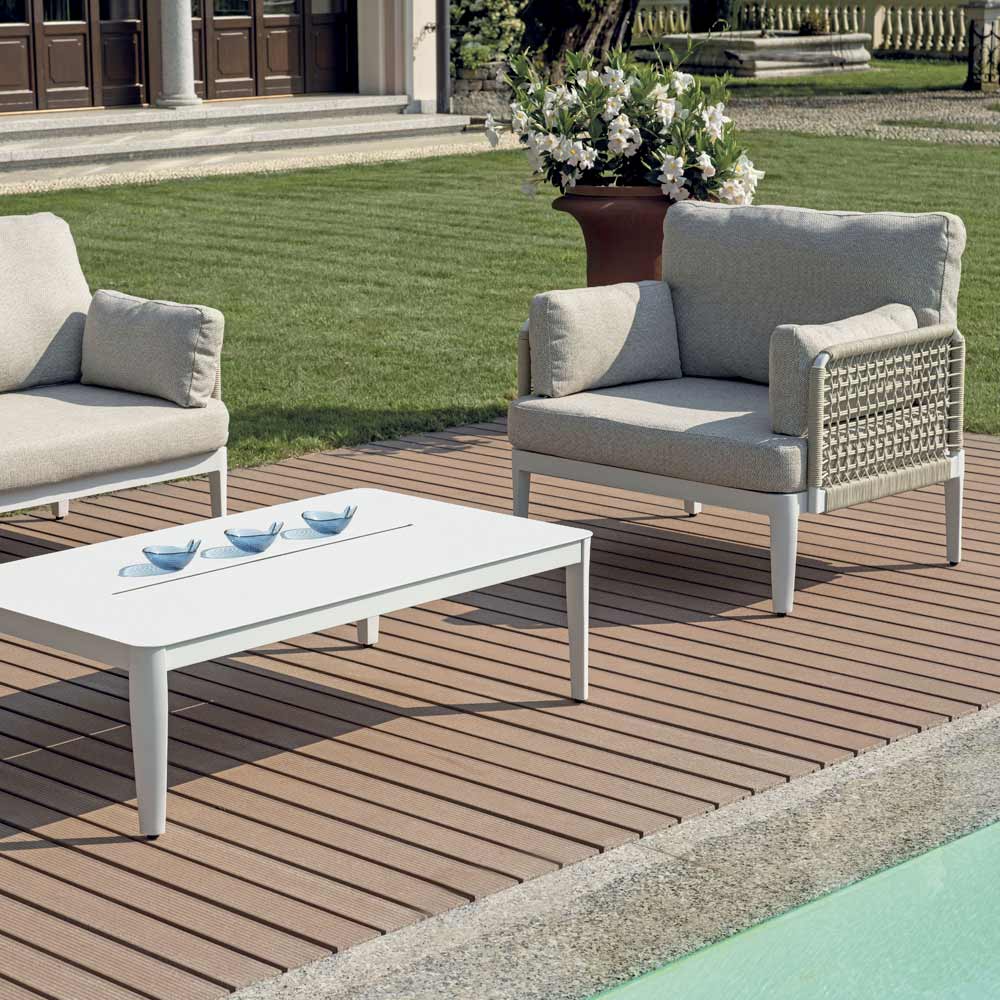 Tento zahradní obývací pokoj je ideálním řešením pro ty, kteří hledají dokonalou rovnováhu mezi elegancí a pohodlím. Tato souprava, která se skládá z křesel a pohovky s čalouněnými polštáři a robustního konferenčního stolku, je ideálním doplňkem pro příjemné chvíle odpočinku venku. Moderní design a čisté linie se dokonale hodí do každého venkovního prostředí, od prostorných teras až po útulné zahrady.