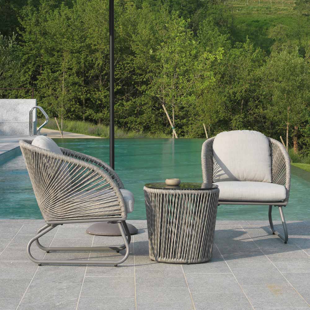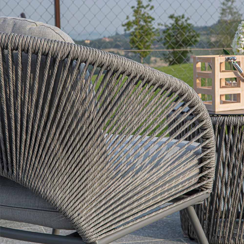 Rám je vyroben z polyesteru odolného proti povětrnostním vlivům a je upevněn na pevné hliníkové základně, která zajišťuje odolnost a stabilitu. Antracitově šedá barva sedáků se harmonicky snoubí s odpovídajícím stolkem , který dotváří elegantní a moderní vzhled soupravy.