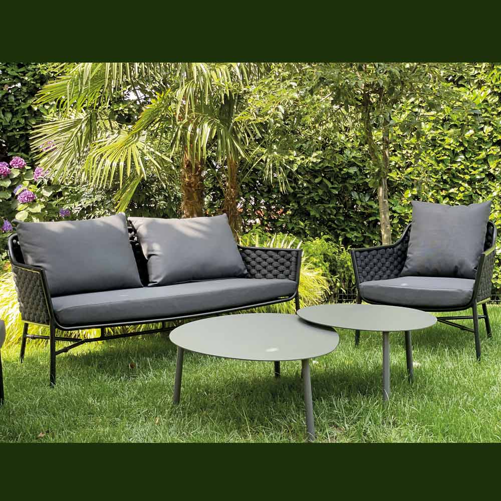 Tato sada se skládá z pohovky, křesla a odpovídajících konferenčních stolků a je ideální pro ty, kteří hledají prostředí, kde styl a funkčnost koexistují v harmonii. Tmavá paleta zvýrazňuje okolní zeleň a vytváří rafinovaný vizuální kontrast.