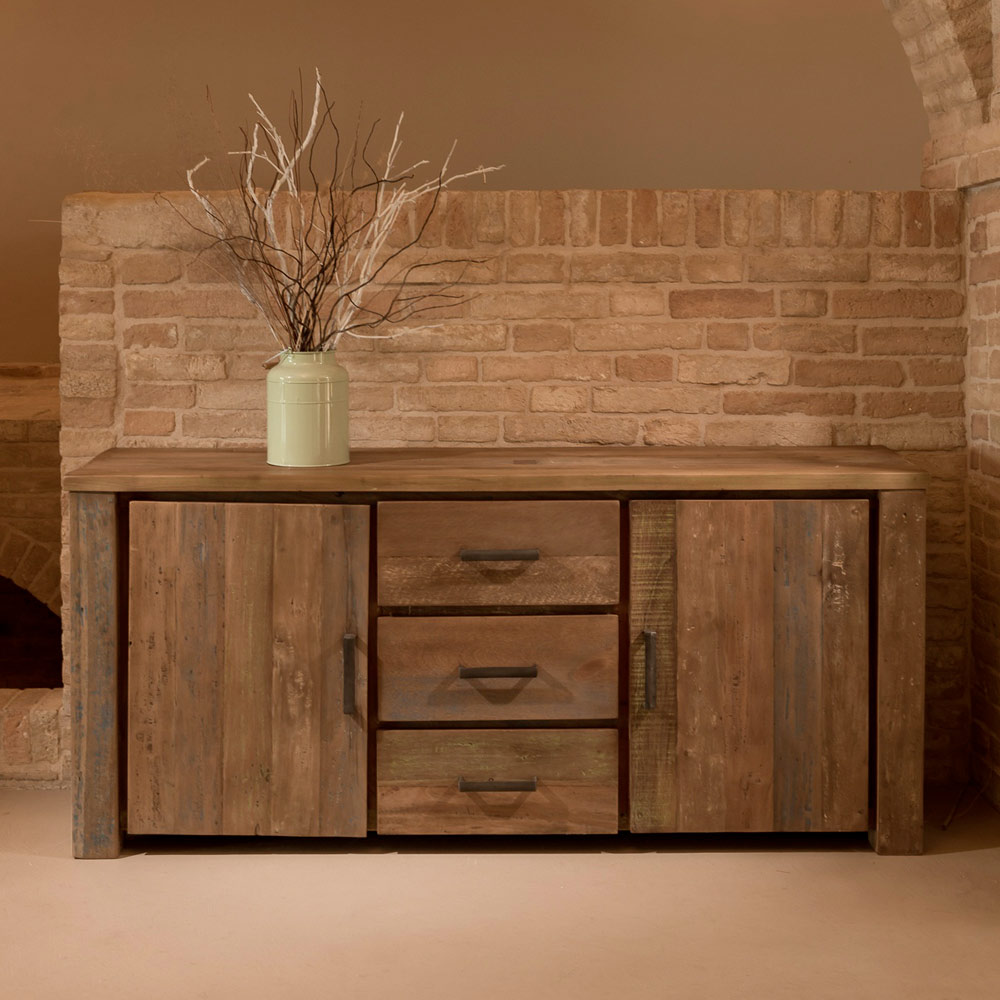 Vnitřní příborník z recyklovaného dřeva s povrchovou úpravou Pandora se 2 dvířky a 3 centrálními zásuvkami .