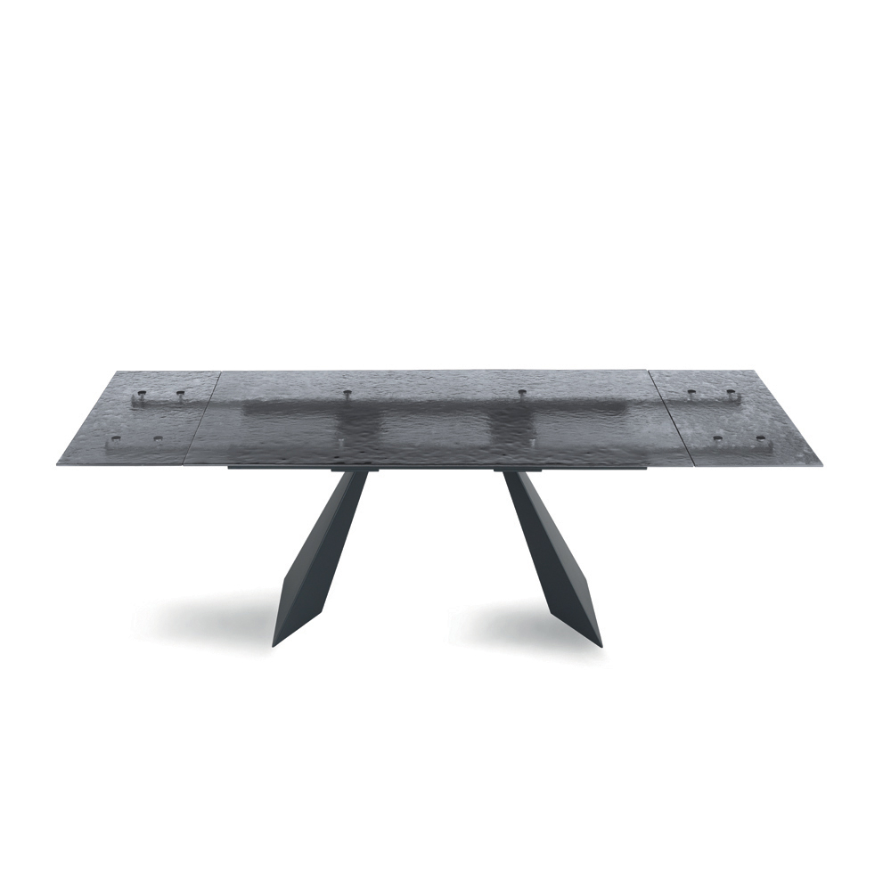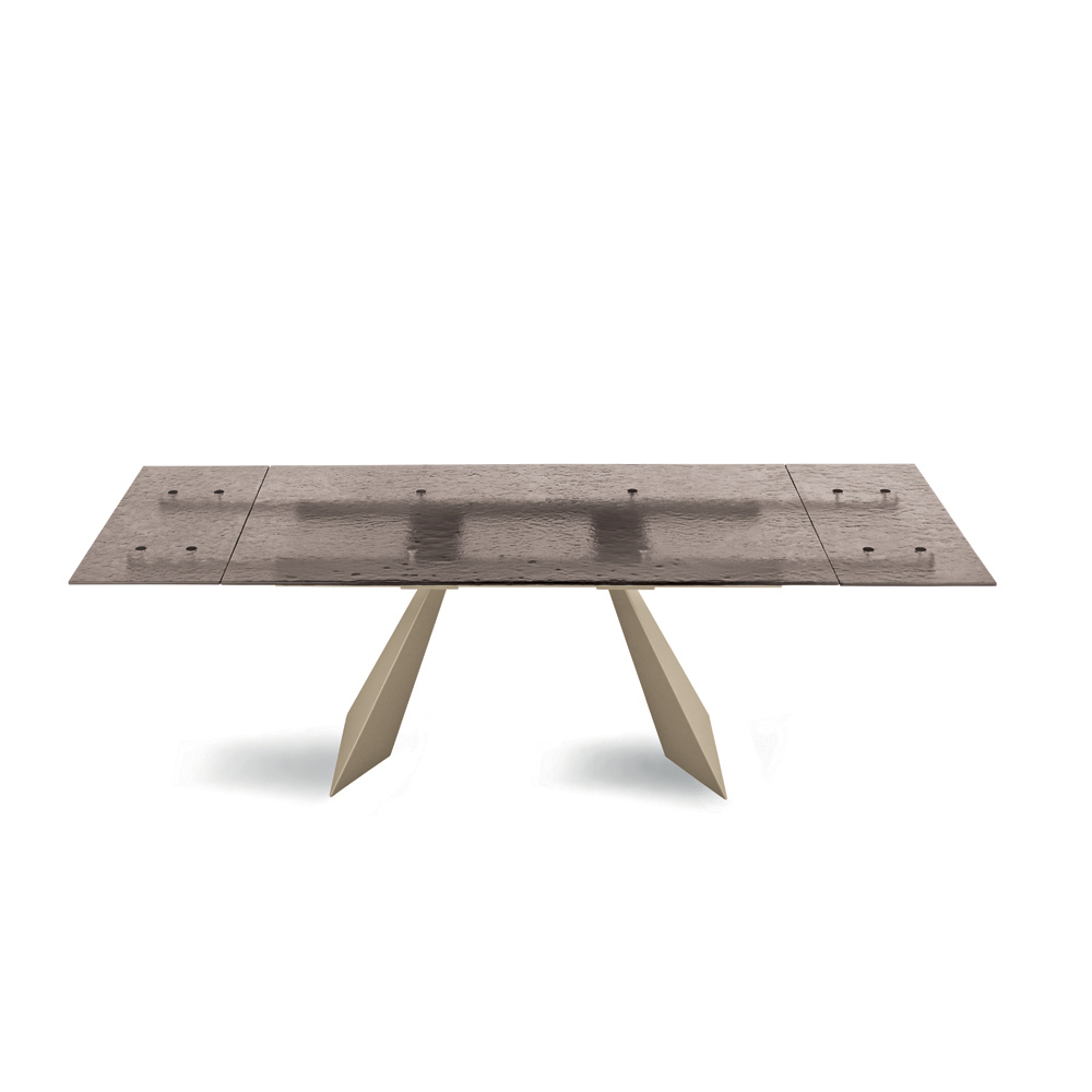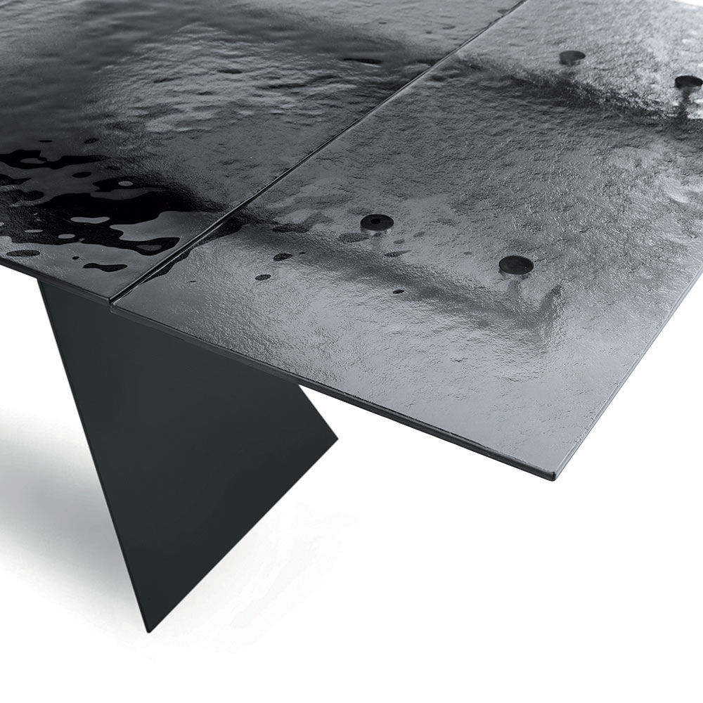 Tento stůl, podepřený kovovými nohami vyřezanými do tvaru geometrických trojúhelníků, je nejen robustní, ale také výrazným stylovým prvkem. Kombinace skla a kovu nejen zajišťuje odolnost a stabilitu, ale také dodává stůl optickou lehkost, díky čemuž je ideální pro velké i malé prostory.