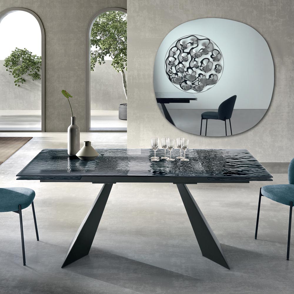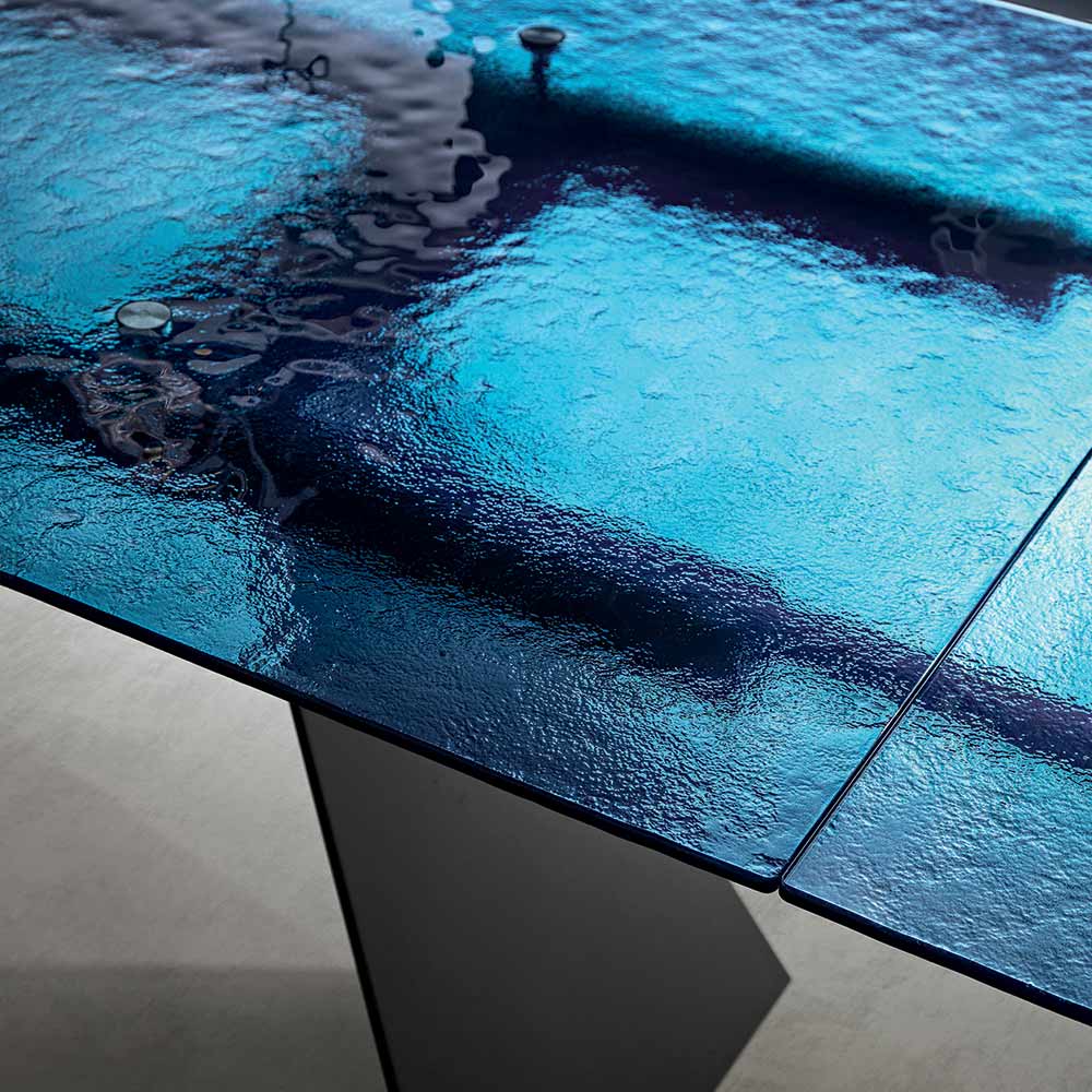 Tento jídelní stůl představuje inovativní interpretaci moderního designu, kombinující vysoce kvalitní materiály a sochařský tvar, který poutá pozornost. Deska stolu vyrobená z tepaného skla je skutečným uměleckým dílem: každý detail jejího povrchu odráží světlo jedinečným způsobem a vytváří hru odrazů a průhledností, která prostoru dodává hloubku a vizuální zajímavost.