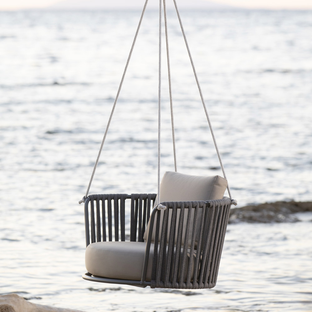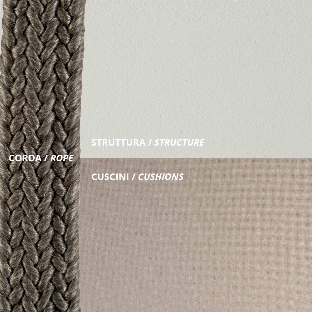 Houpačka na venkovní nábytek z pozinkované oceli a lana, kompletně vyrobená v Itálii , včetně sedáku, opěradla a lan . Pozinkování zajišťuje větší odolnost povrchové úpravy vůči korozivním atmosférickým vlivům, zatímco lana jsou odolná vůči chlóru, slunečnímu záření a plísním. Polštáře jsou vyrobeny z materiálu odolného vůči UV záření a vodě, který si dlouhodobě zachovává barvu, díky čemuž je houpačka perfektním prvkem pro doplnění jakéhokoli venkovního prostředí.
