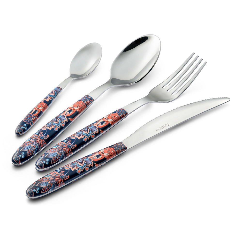 Sada příborů z nerezové oceli a barevná plastová rukojeť s tygrem, 24 kusů italské výroby.
