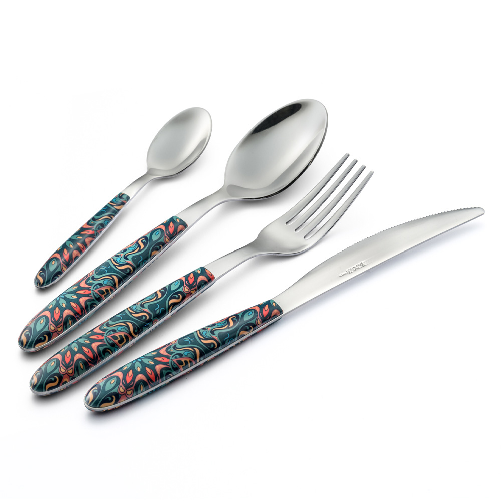 Sada nerezových příborů a barevná plastová rukojeť s květinovým zdobením, 24 kusů italské výroby.