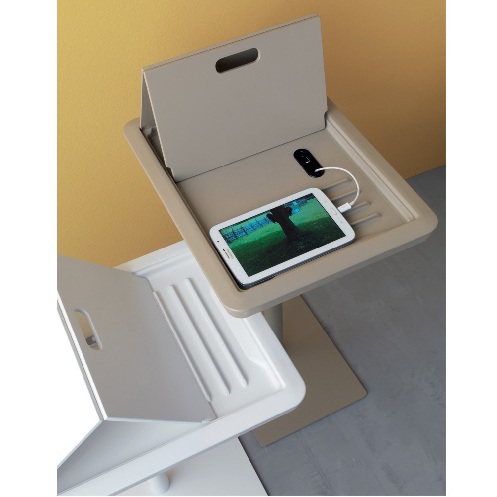otvorem pro průchod kabelu. Takto design doplňku umožňuje správně používat a skladovat každý předmět a zároveň udržovat v pořádku potřebné kabely.