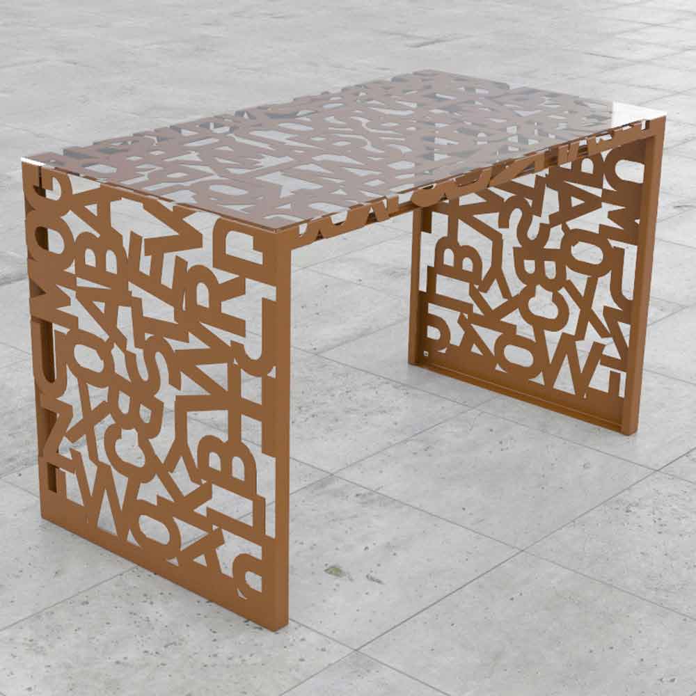 Stůl konstrukce Kattedra se rodí z jedné složené kovové desky a vyšívané s laserem pro vytvoření originální plochu písmen.