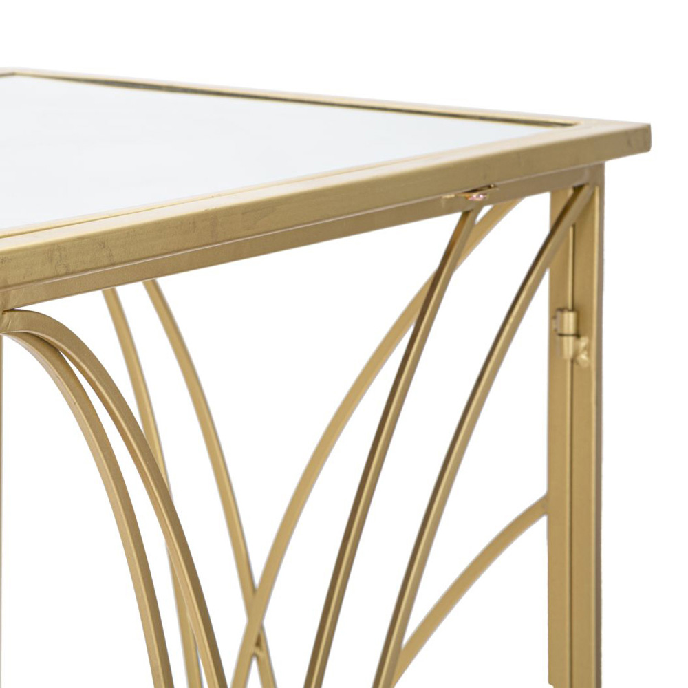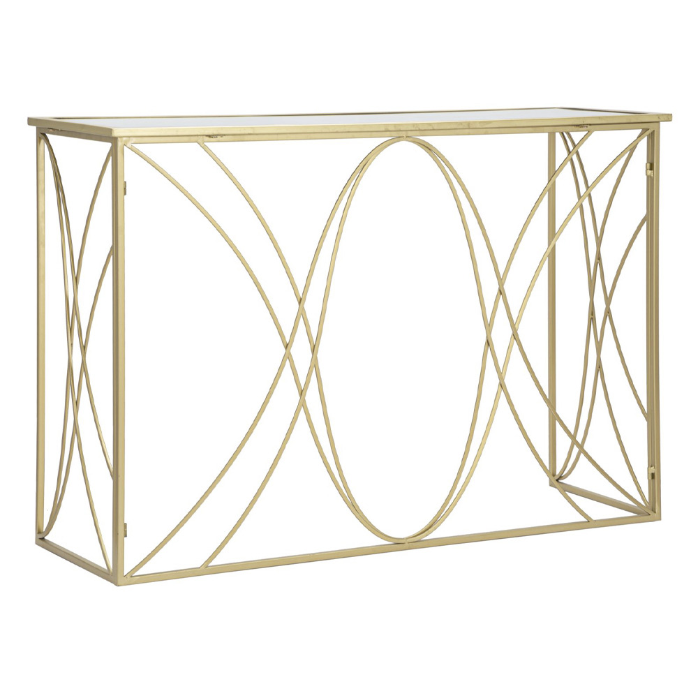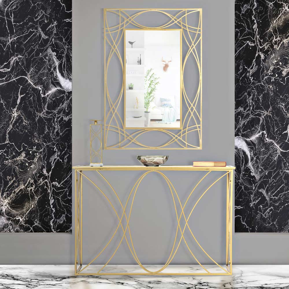 Pevná vstupní konzola se strukturou ze zlaté povrchové úpravy železa se zrcadlovou deskou . Jednoduchý a podmanivý design je jedinečný a exkluzivní díky konkrétní základně, která využívá křivolaké linie a geometrické tvary k obohacení estetiky výrobku, která dodává nádech osobnosti . Výsledkem je propracovaná a avantgardní konzole, která se díky své univerzálnosti a současnému charakteru dokáže přizpůsobit jakékoli moderní stylistické situaci.