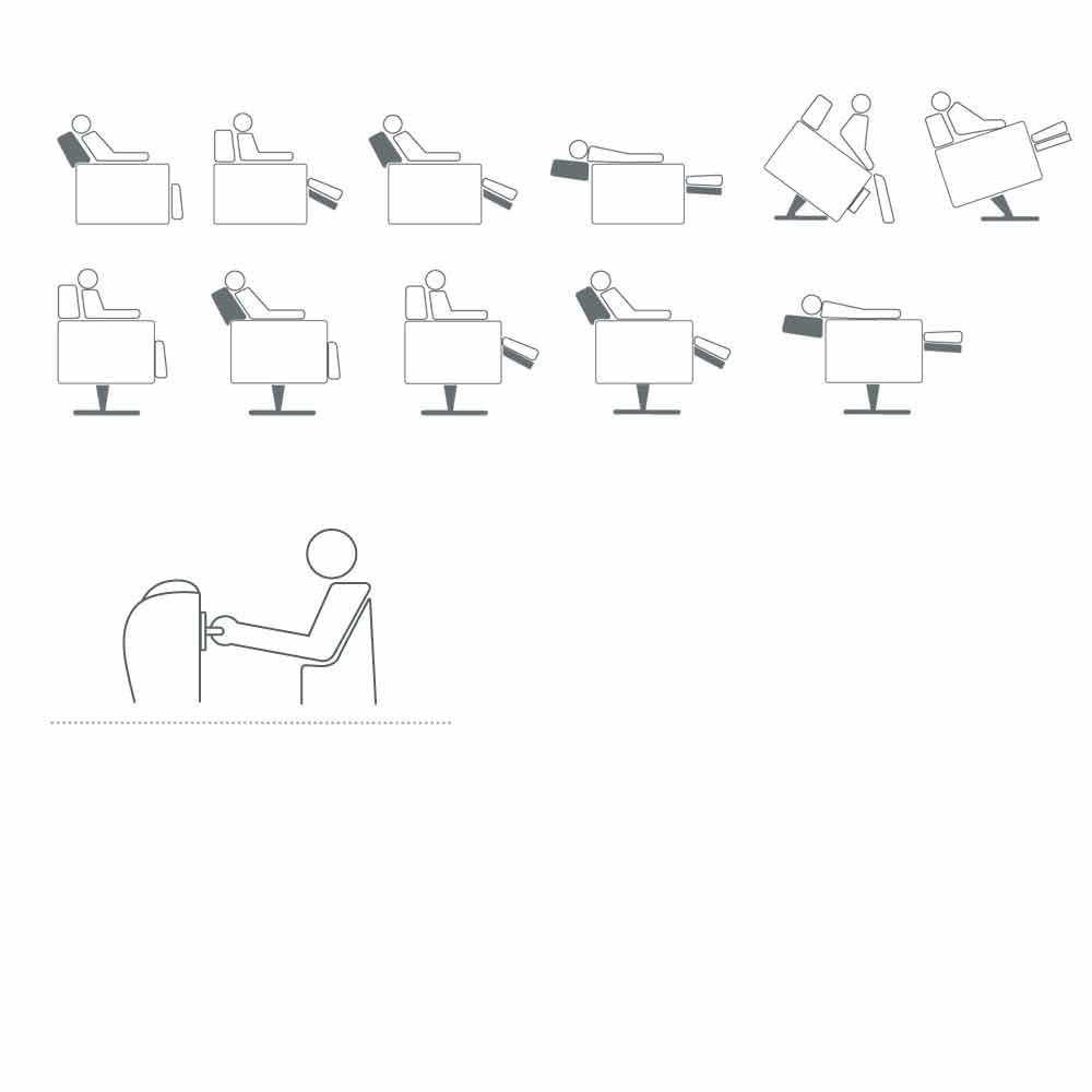 Mechanismy s jedním nebo dvěma motory , pohyb opěrky nohou a zádové opěrky alternativně autonomní nebo nezávislý , funkce zvedání , zvedací zařízení umožňující snadné zaujmutí vzpřímené polohy, vibromasáž pro příjemný efekt rozložený na opěradlo, sedák a stupačku, automatický nebo motorický pohyb, Toto jsou vyvinuté možnosti a kombinace: harmonický soubor řešení pro uspokojení všech typů potřeb.