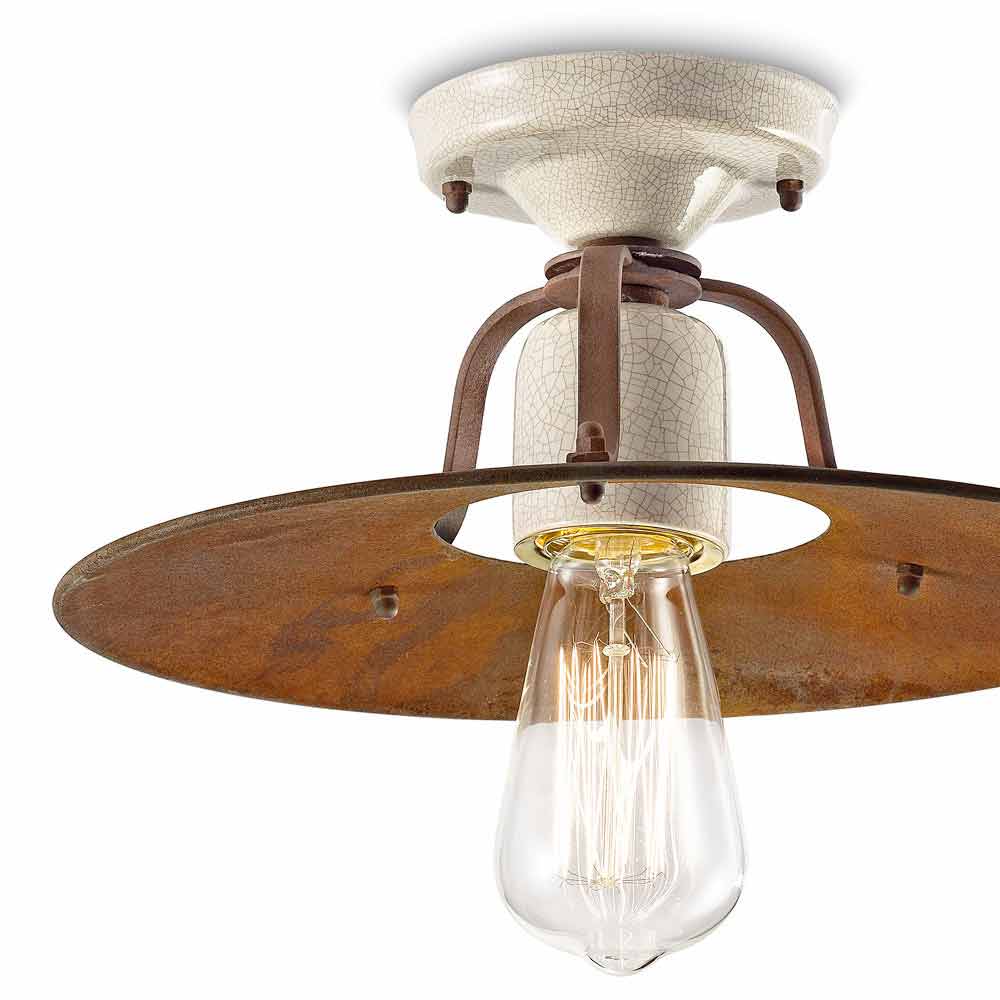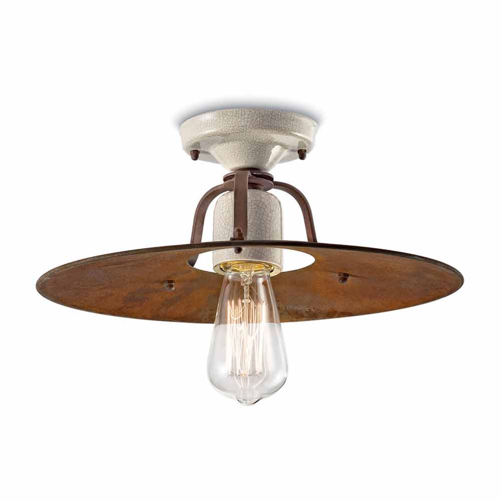 Toto krásné stropní svítidlo je tvořeno kovovou korunkou v matné rzi, zatímco keramické části, které ji tvoří, jsou zpracovány s craquelé detaily, aby byla dokončena rovnováha plných a prázdných tvarů. Právě tyto materiály dávají Elaine roli připomínat minulost a dotvářejí její industriální styl.
