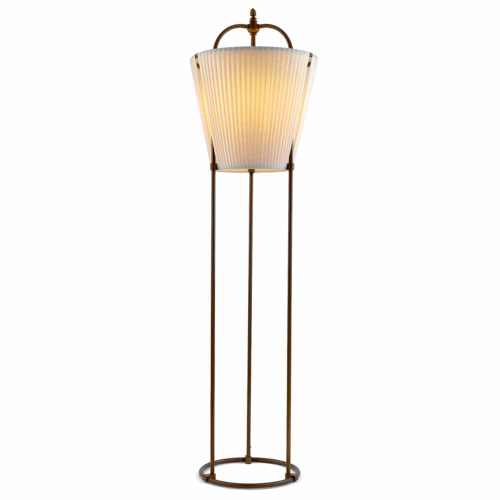 Designérská stojací lampa Tenarunga od Alda Bernardiho, vyrobená z antické mosazi a látky.