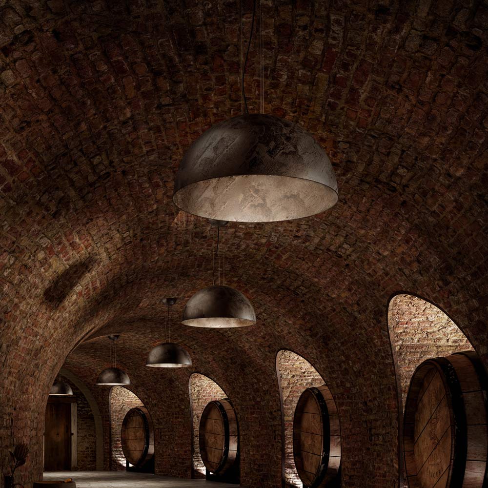Graf tučné tahy a perfektní poloviny koule charakterizují tuto kolekci svítidel, která je navržena jako pocta astronomické revoluci. Kontrast mezi vnější mosazi nebo železa a vnitřkem z plátkového zlata, stříbra nebo mědi list, dává tento produkt estetickou hodnotu velký vizuální efekt. K dispozici s vnějším mosazi nebo železa 30,40,60 cm v průměru a s vnějším železa 80 cm v průměru.