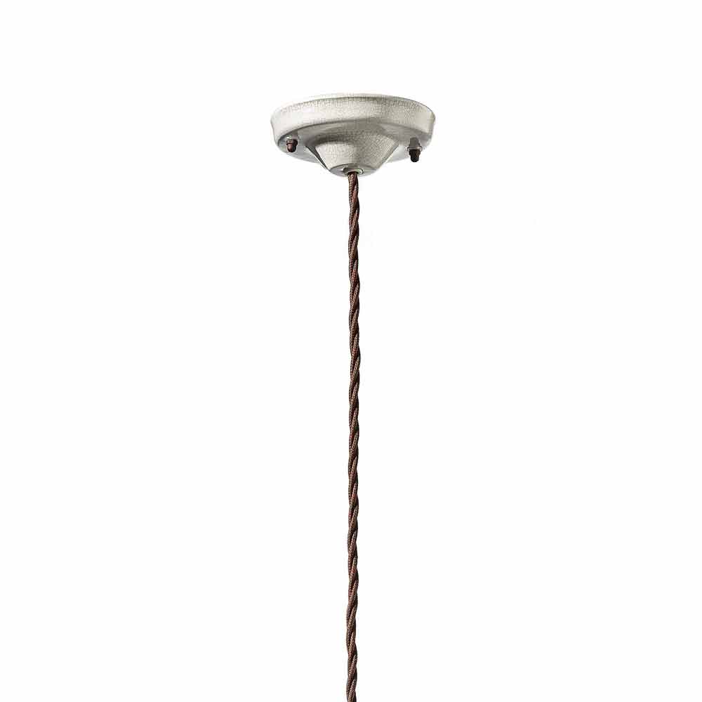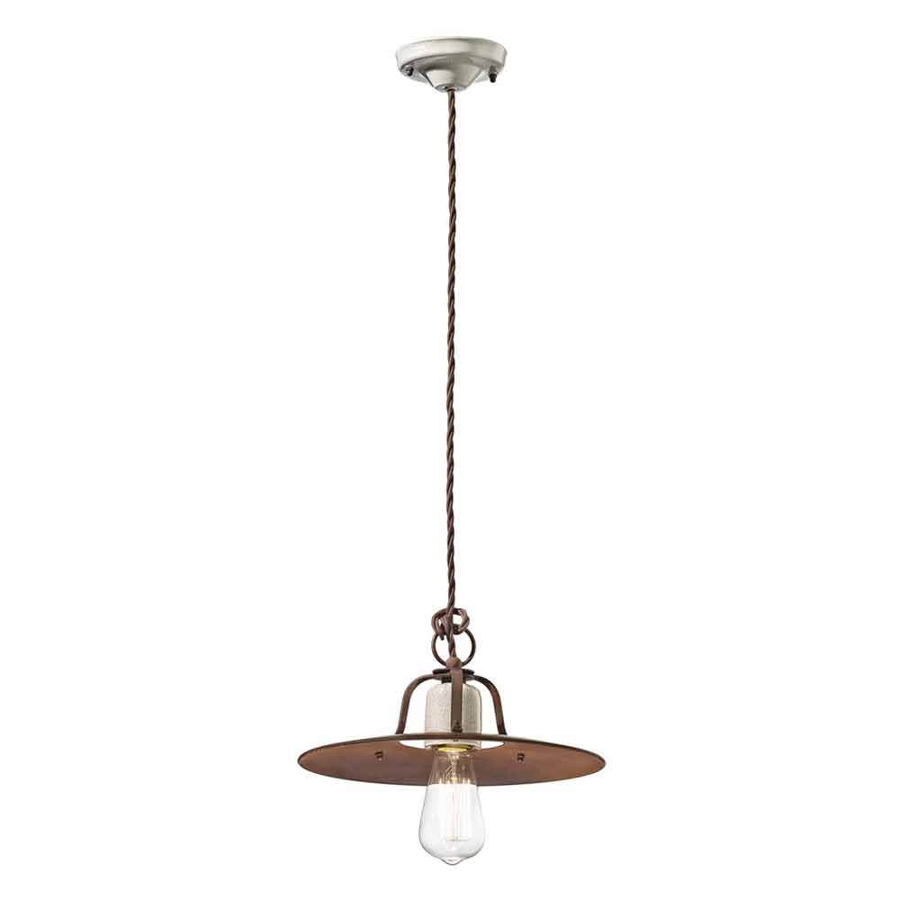 Široká korunka a snadno nastavitelná výška díky pletenému kabelu, který dotváří industriální styl. Matné rezavé kovové a keramické detaily dotvářejí rovnováhu plných a prázdných tvarů. Je inspirován americkým rustikálním stylem. Tato lampa se svými matnými barvami a zažitou chutí je jednoduchá a nadčasová. Čisté světlo bez stínění.