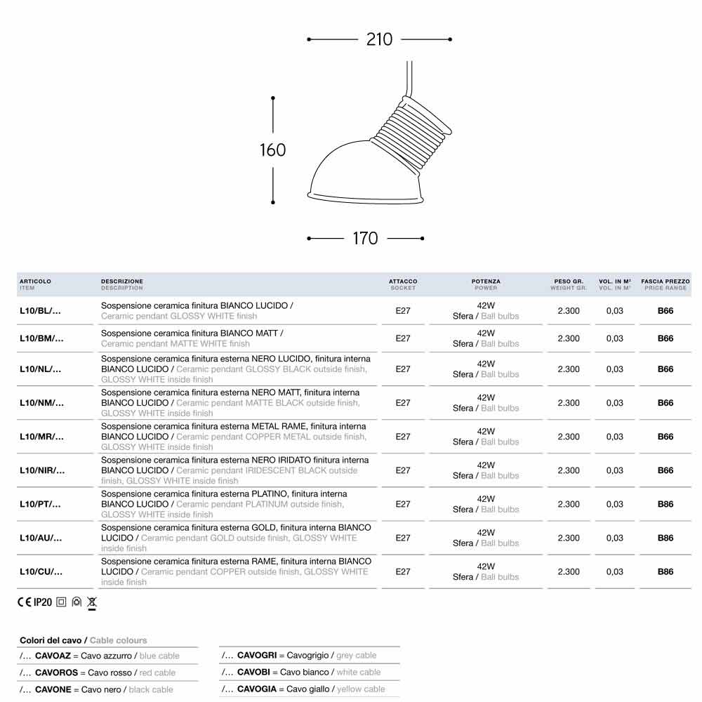 I Lustri 10 je k dispozici v různých barvách a se světle modrým, bílým, červeným, černým, šedým nebo žlutým kabelem.