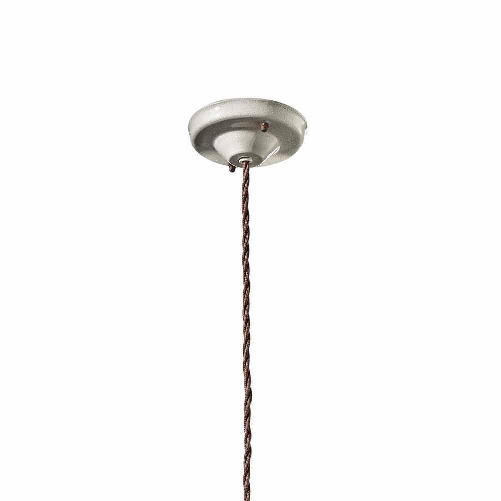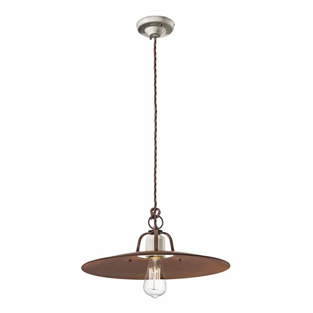 Široká korunka a snadno nastavitelná výška díky pletenému kabelu, který dotváří industriální styl. Matné rezavé kovové a keramické detaily dotvářejí rovnováhu plných a prázdných tvarů. Je inspirován americkým rustikálním stylem. Tato lampa se svými matnými barvami a zažitou chutí je jednoduchá a nadčasová. Čisté světlo bez stínění.