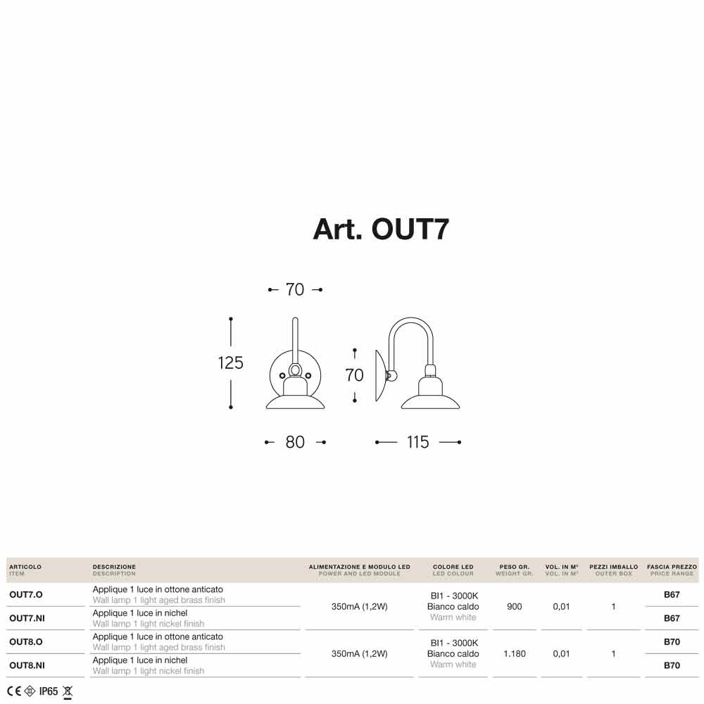 Venkovní designová nástěnná lampa Giulietta Sprint - malá od Alda Bernardiho, vyrobená z mědi a mosazi.