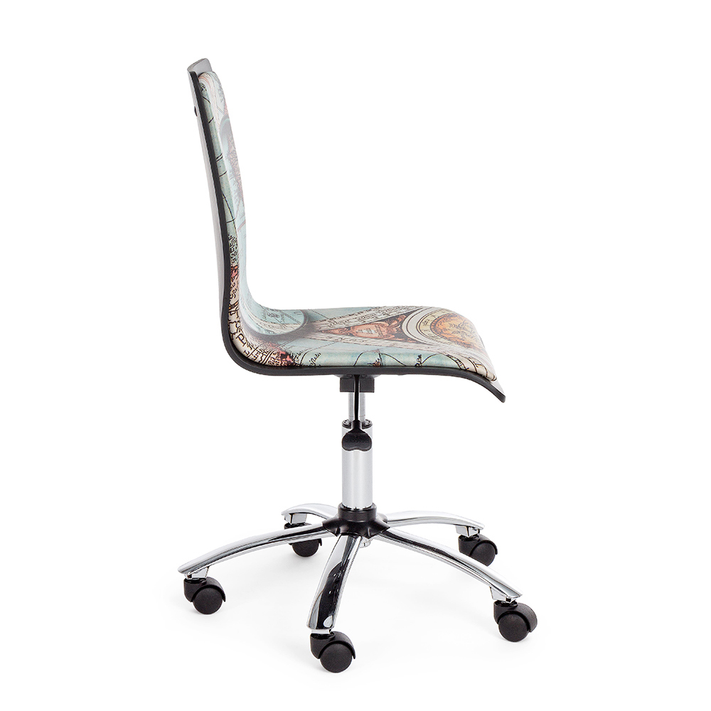 Ocelová kancelářská židle s kolečky a sedákem z ekokůže s potiskem mapy.