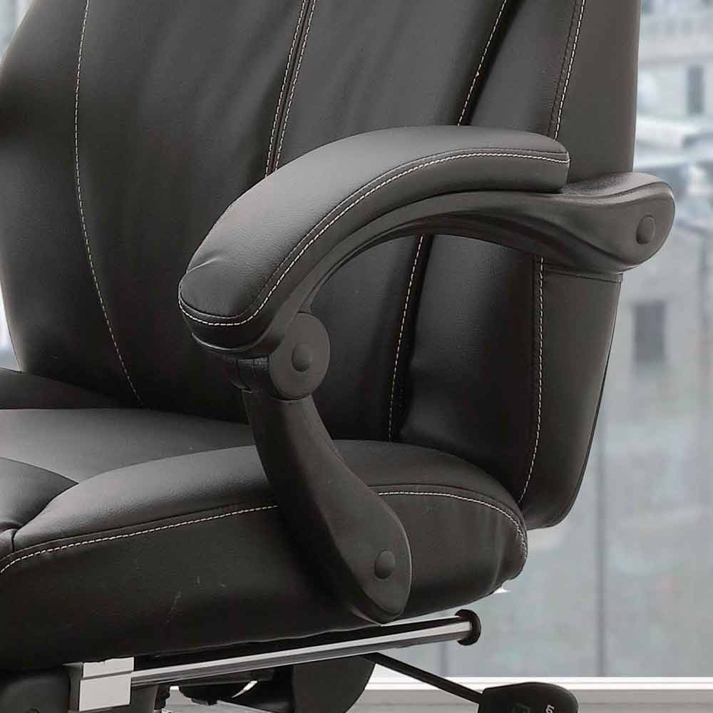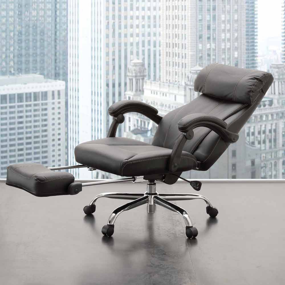 Kancelářské křeslo Nazzareno nejlépe reprezentuje všechny tyto vlastnosti; přichází s otočným sedadlem s plynovým výtahem, opěradlem s polštářem potaženým černou umělou kůží, sedadly a opěradlem z černé umělé kůže; chromovaný kovový rám s koly.