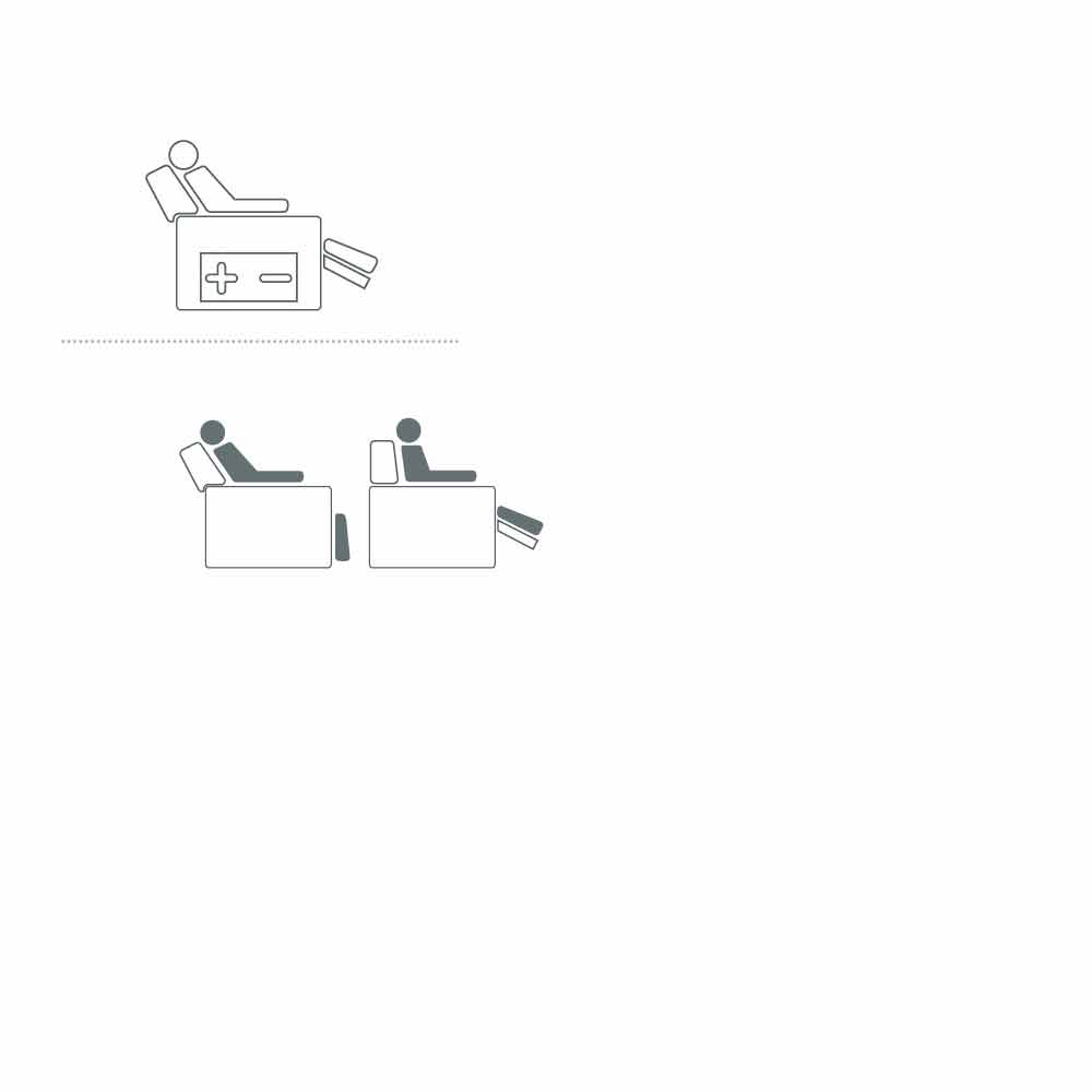 Poloha nebo čtení televize : opěradlo zůstává v poloze, aby proniklo do sedadla, a stupačka se otevírá, aby zajistila pohodlí v nohách.