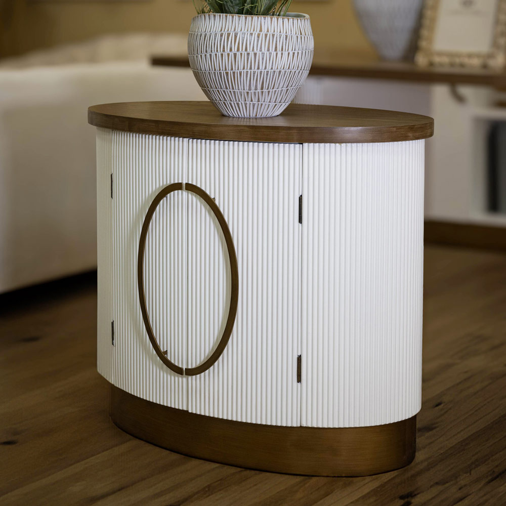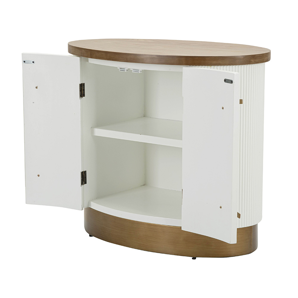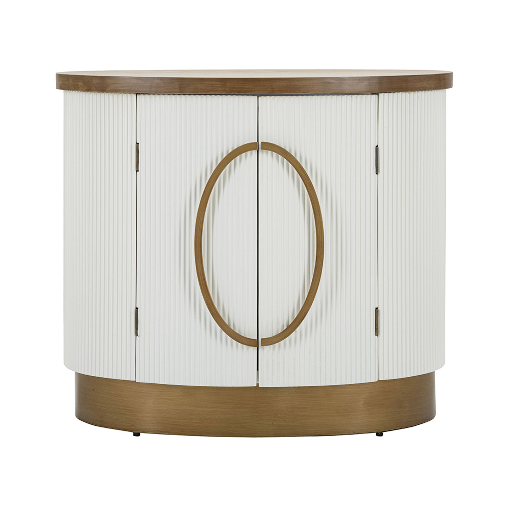 Důmyslná drážka dvířek dodává jemnou hru světla a stínu, zatímco kruhové kliky vnášejí dotek rafinovanosti . Tento kus nábytku nabízí nejen estetickou zajímavost, ale také velkou úložnou kapacitu, díky čemuž je praktický i krásný.