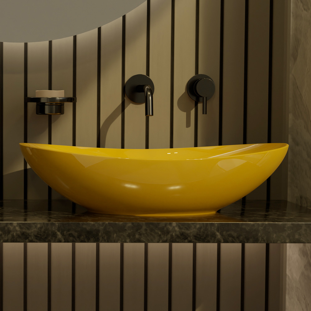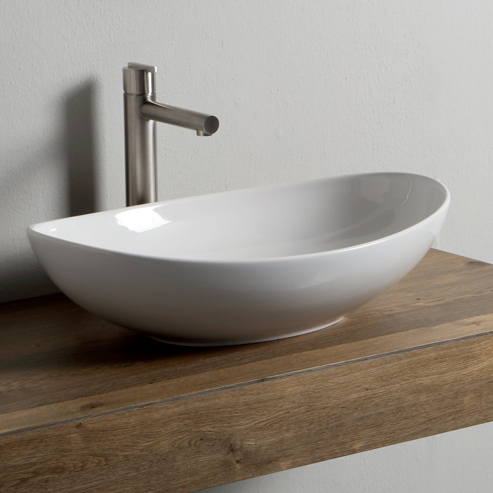 Oválné umyvadlo na desku z lesklé nebo matné barevné keramiky vyrobené v Itálii díky řemeslnému zpracování . Souvislé a harmonické linie dávají život modernímu a avantgardnímu designu určenému pro ty, kteří milují jednoduchý a všestranný styl, aniž by se ve své koupelně vzdali originálního doteku.