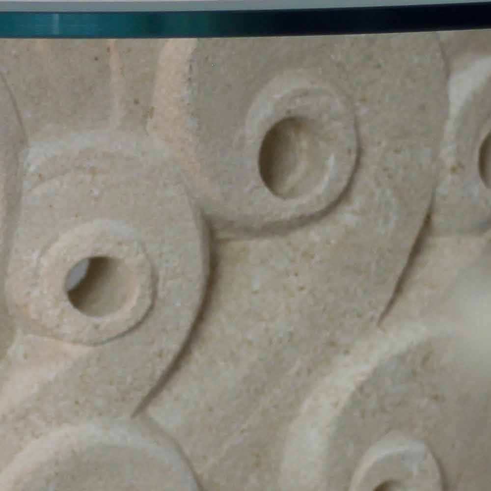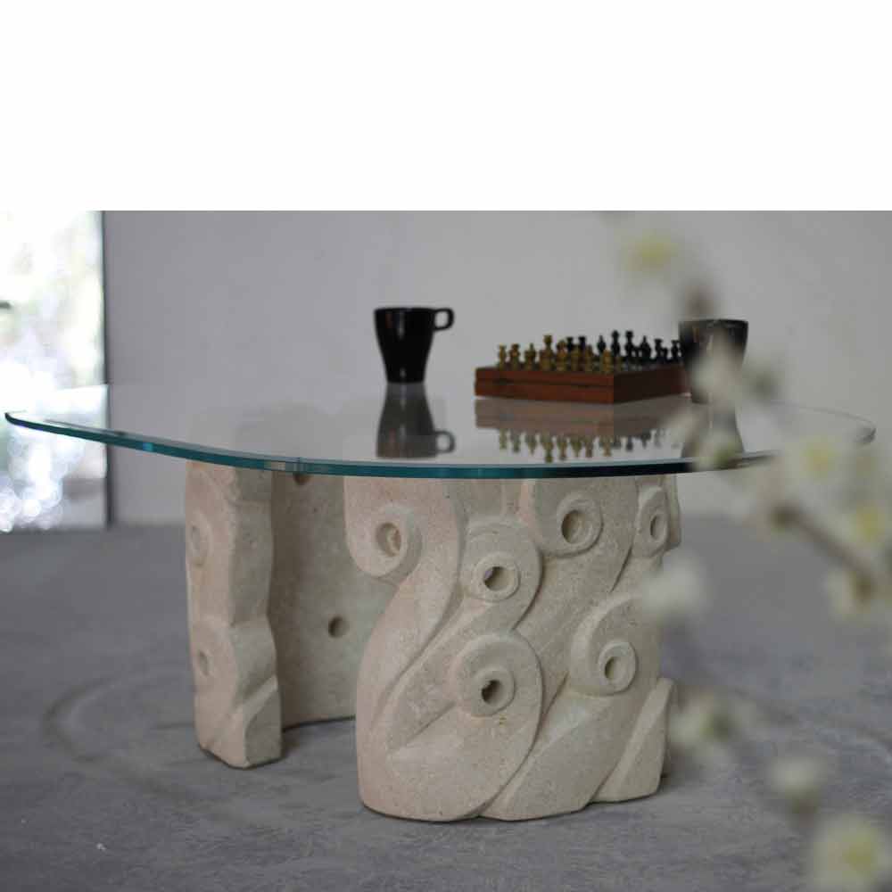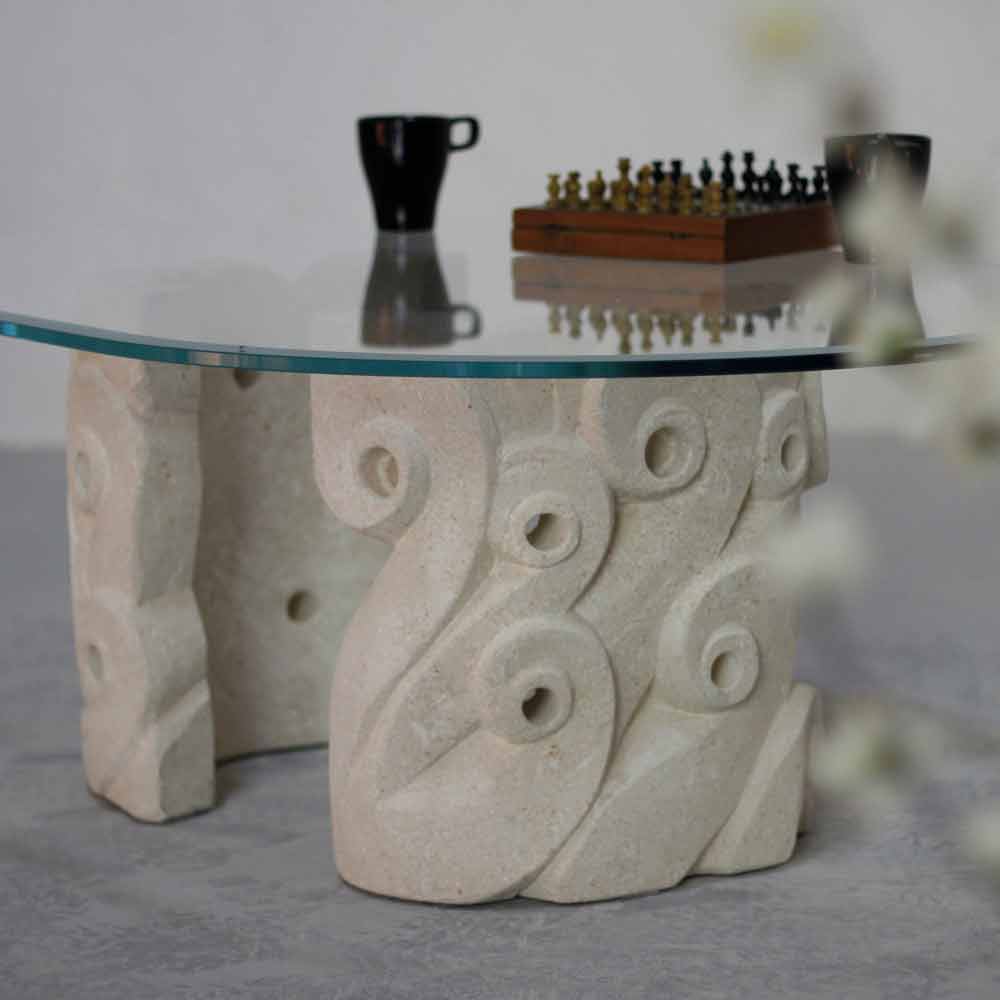 Oválný kámen a skleněný konferenční stolek, Lindos