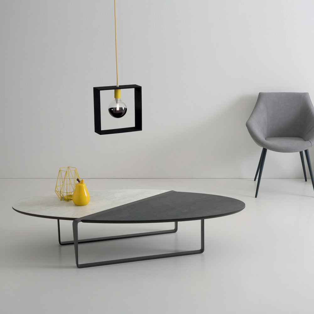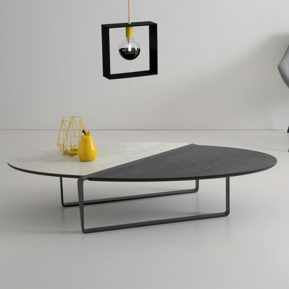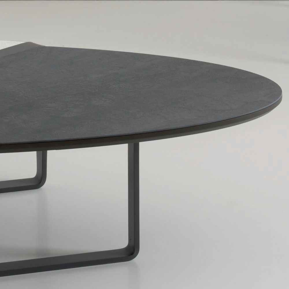 Tento oválný designový konferenční stolek má kovovou základnu s embosovanou grafitovou práškovou barvou a dvoubarevnou matnou keramickou desku na panelu.
