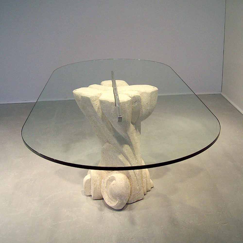 Moderní oválný jídelní stůl Vyrobeno v Itálii s centrální základnou v přírodním kameni Vicenza , ručně vyřezávané z pevného bloku a 15 mm tlustého plaveného skla, které je podepřeno kartáčovaným a lakovaným surovým kovovým barem.