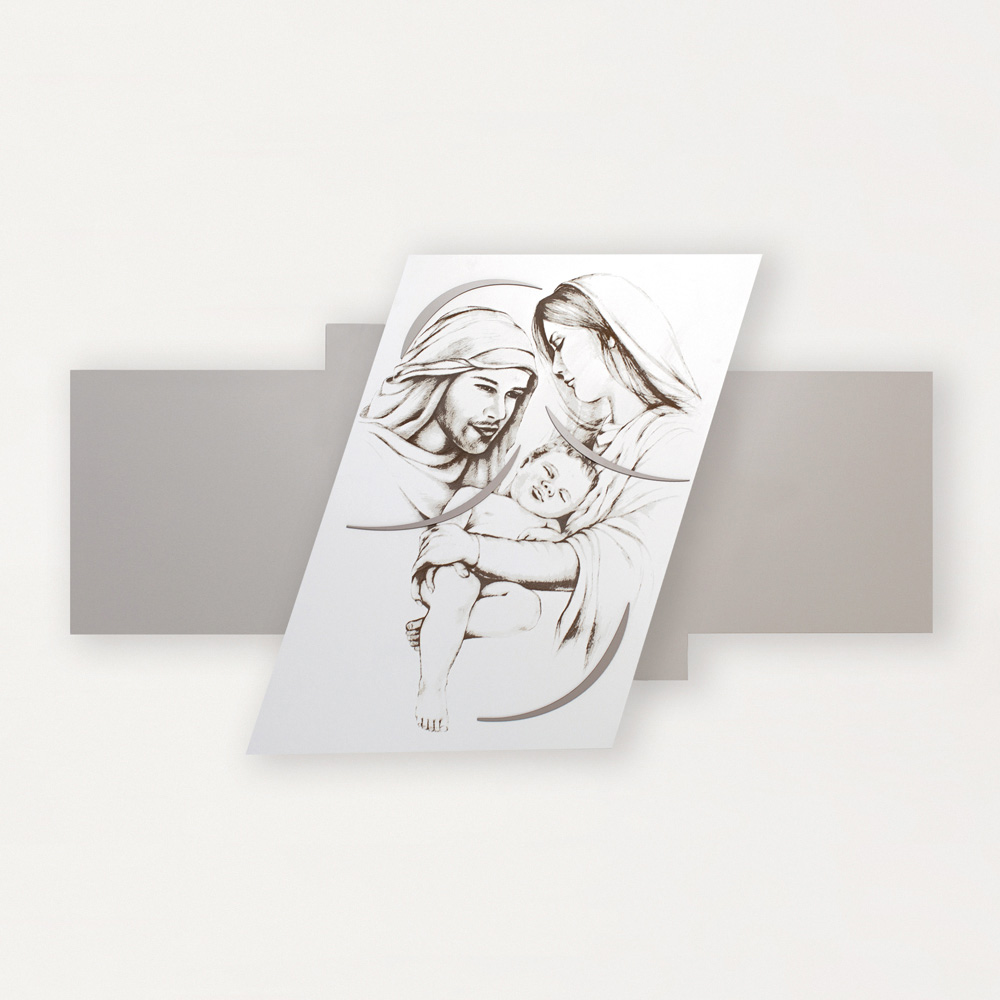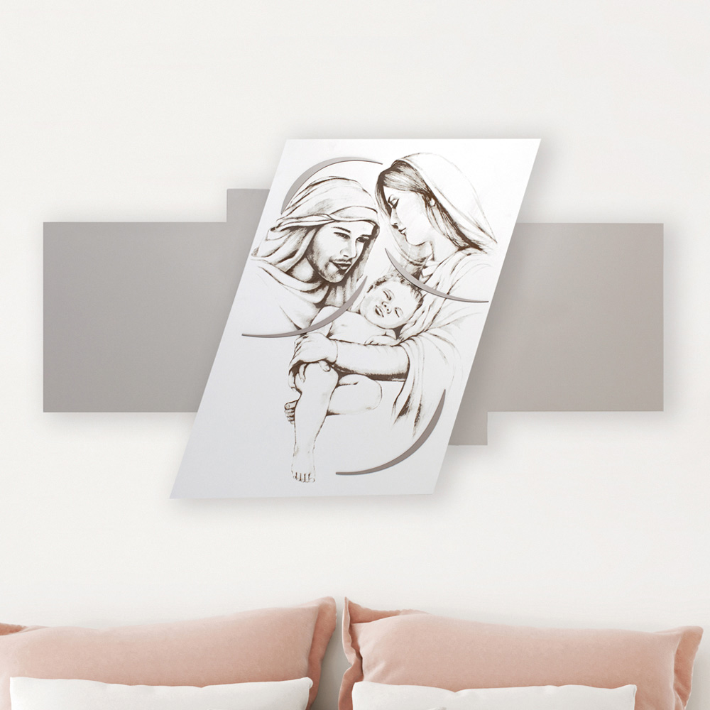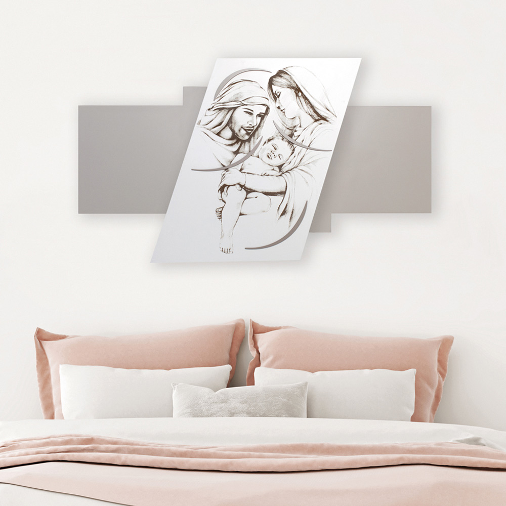 Představuje Svatou rodinu v laserovém značení, jedná se o čelo postele s minimalistickým designem ideální pro moderní prostředí. Laserem gravírovaný neprůhledný bílý lakovaný dřevěný panel na oblázkovém panelu se štěrkovými dekoracemi zobrazující náboženskou scénu.