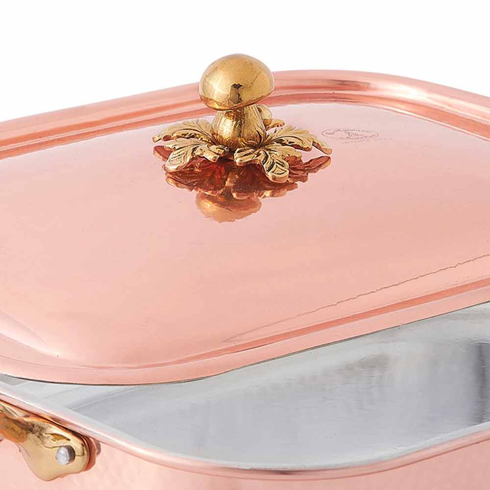 Obdélníkový měděný pekáč s mosazným víkem a držadly, řemeslným zpracováním v Itálii.
