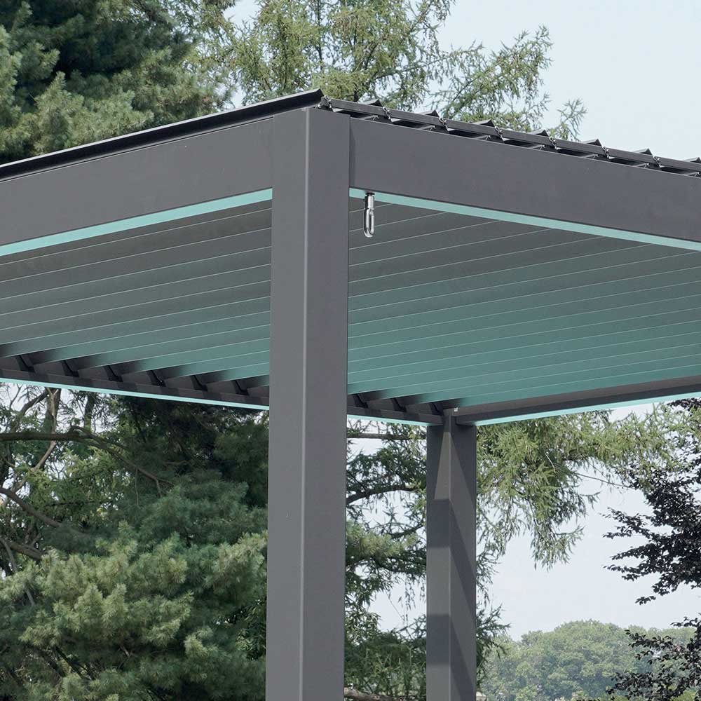 Nastavitelná žaluziová střecha umožňuje extrémně snadno nastavit množství světla a stínu a vytvořit tak pohodlnou atmosféru kdykoli během dne. Neutrální a sofistikovaná barva podtrhuje čisté linie a nabízí pocit řádu a kultivovanosti .