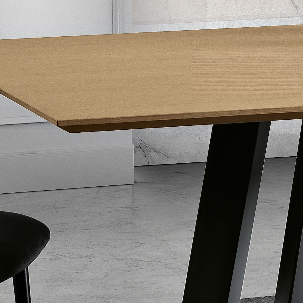 Struktura je podpořena kovovými nohami, které se proplétají do odvážných geometrických tvarů, kombinující pevnost a avantgardní design. Kontrast mezi teplem dřevěné desky a průmyslovostí kovu vytváří ohromující vizuální rovnováhu, díky čemuž je tento kousek ideální pro širokou škálu interiérů, od klasických po současné.