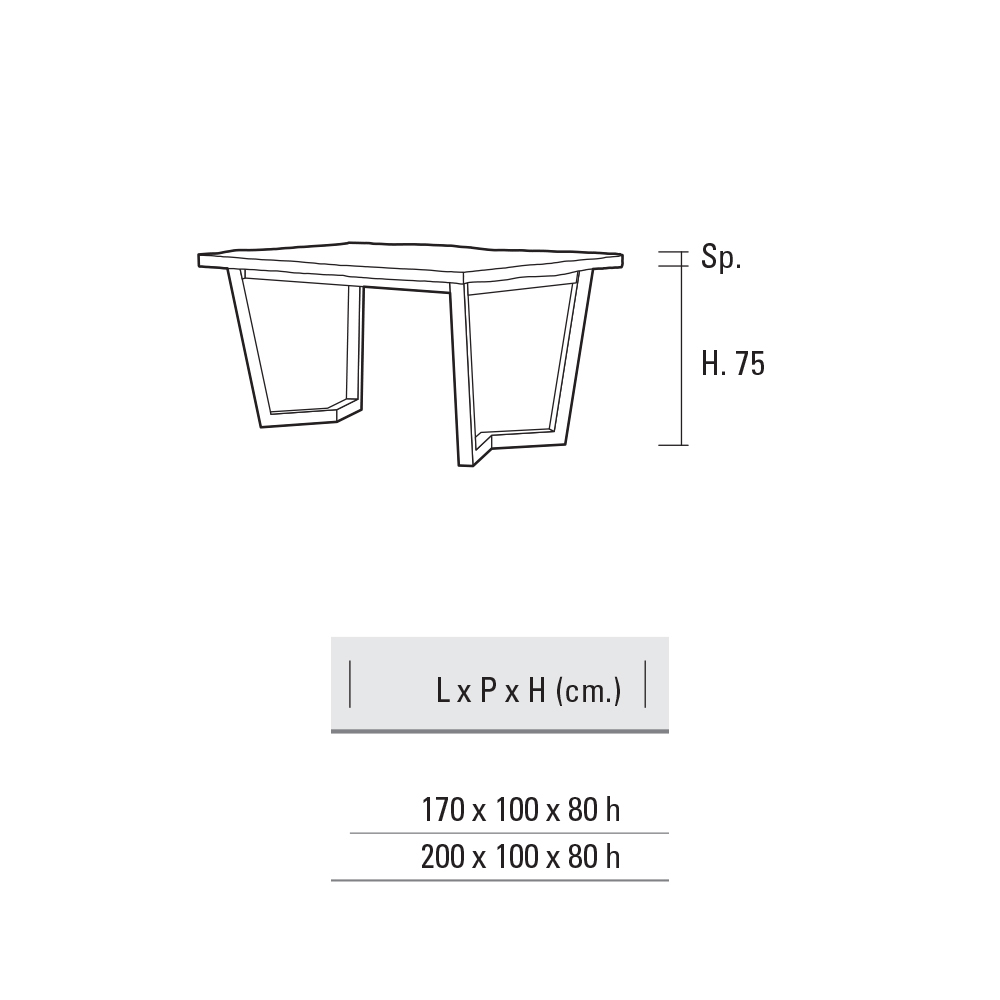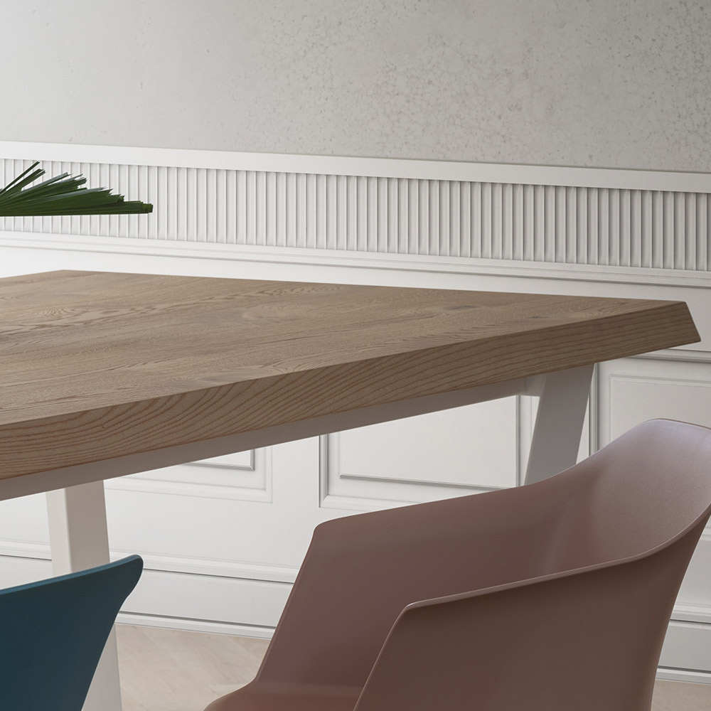 Pevný jídelní stůl s kovovou podnoží a deskou z odkorněného dřeva Made in Italy.