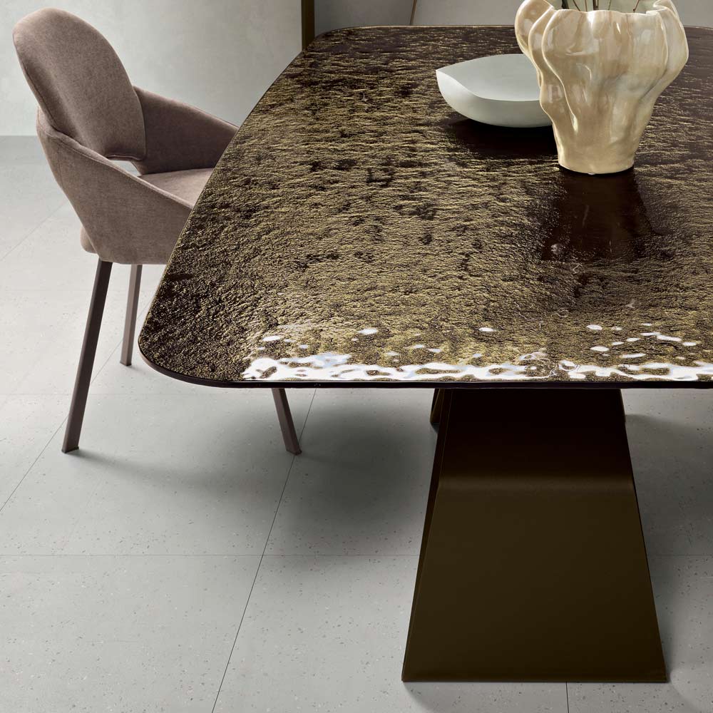Vrchní deska z tepaného skla dodává stolu osobitost díky své jedinečné texturované povrchové úpravě, která nepravidelně odráží světlo a vytváří tak evokativní hru odrazů a hloubky. Tato povrchová úprava zvyšuje jas skla a dodává desce elegantní a dramatickou atmosféru.