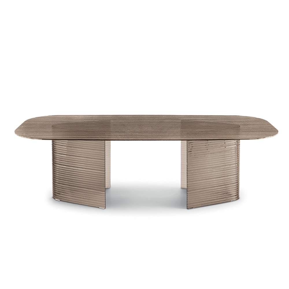 Charakteristická základna, složená ze dvou zakřivených prvků, vytváří sochařskou a dynamickou strukturu, která se stává skutečným protagonistou stolu. Průhlednost skla umocňuje design a udržuje prostor vizuálně světlý, takže se perfektně hodí do moderního a elegantního prostředí.