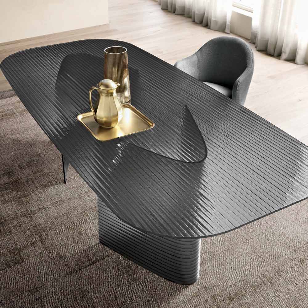 Elegantní jídelní stůl vyrobený v Itálii s rafinovaným, moderním stylem, ideální pro dodání osobitosti vaší jídelně nebo obývacímu pokoji . Tento stůl, vyrobený výhradně z čirého žebrovaného skla , rozjasní každou místnost a vytvoří podmanivou hru světla a odrazů.