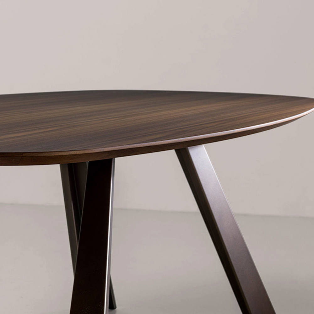 Pevný stůl s eliptickou zkosenou deskou z eukalyptové dýhované laťovky a nohami z lakovaného kovu s bronzovým povrchem . Zkosená horní hrana Rozměry V 77 cm, tloušťka 3 cm.