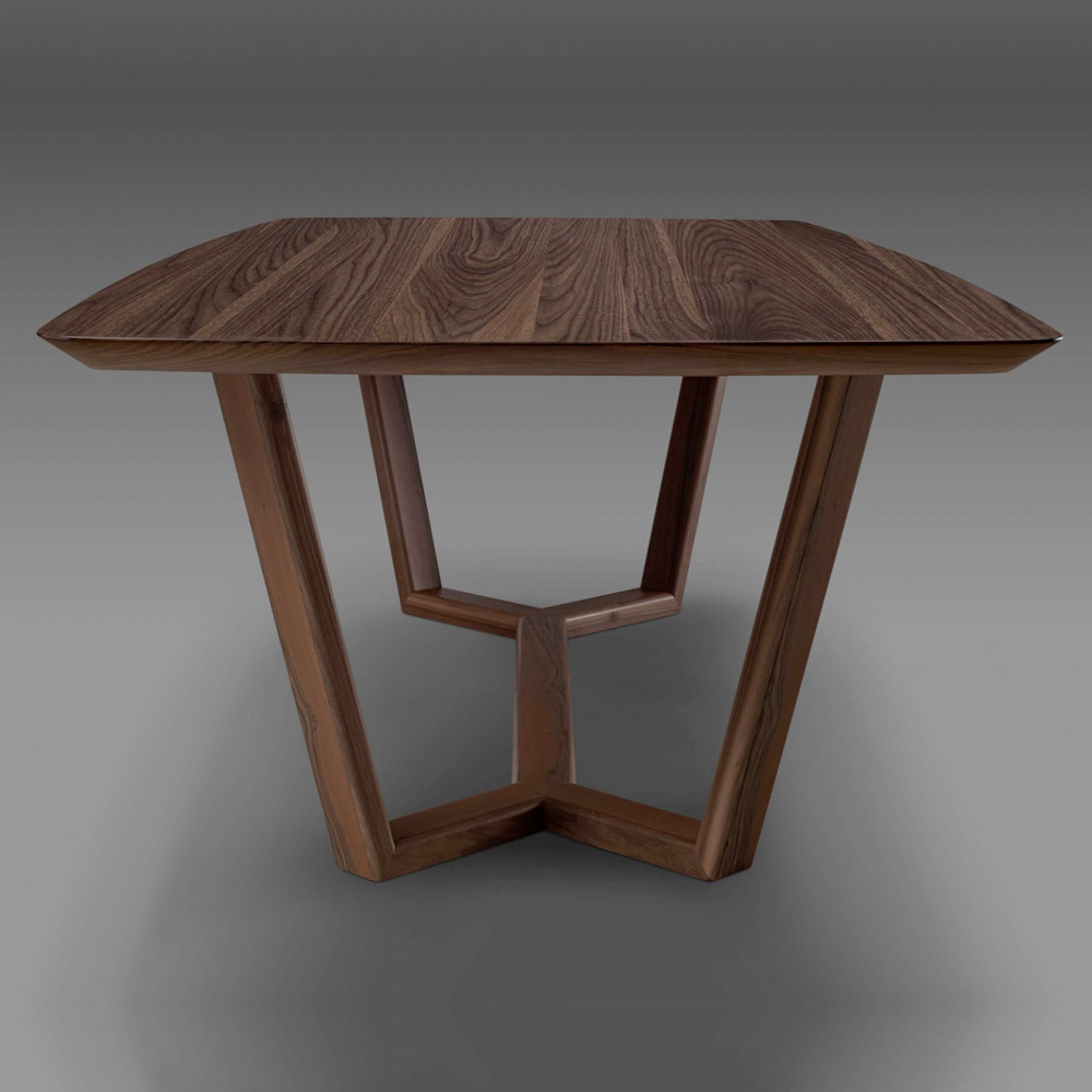 Pevný stůl s tvarovanou a zkosenou deskou na laťovce z ořechové dýhy canaletto a podnoží z masivního dřeva.