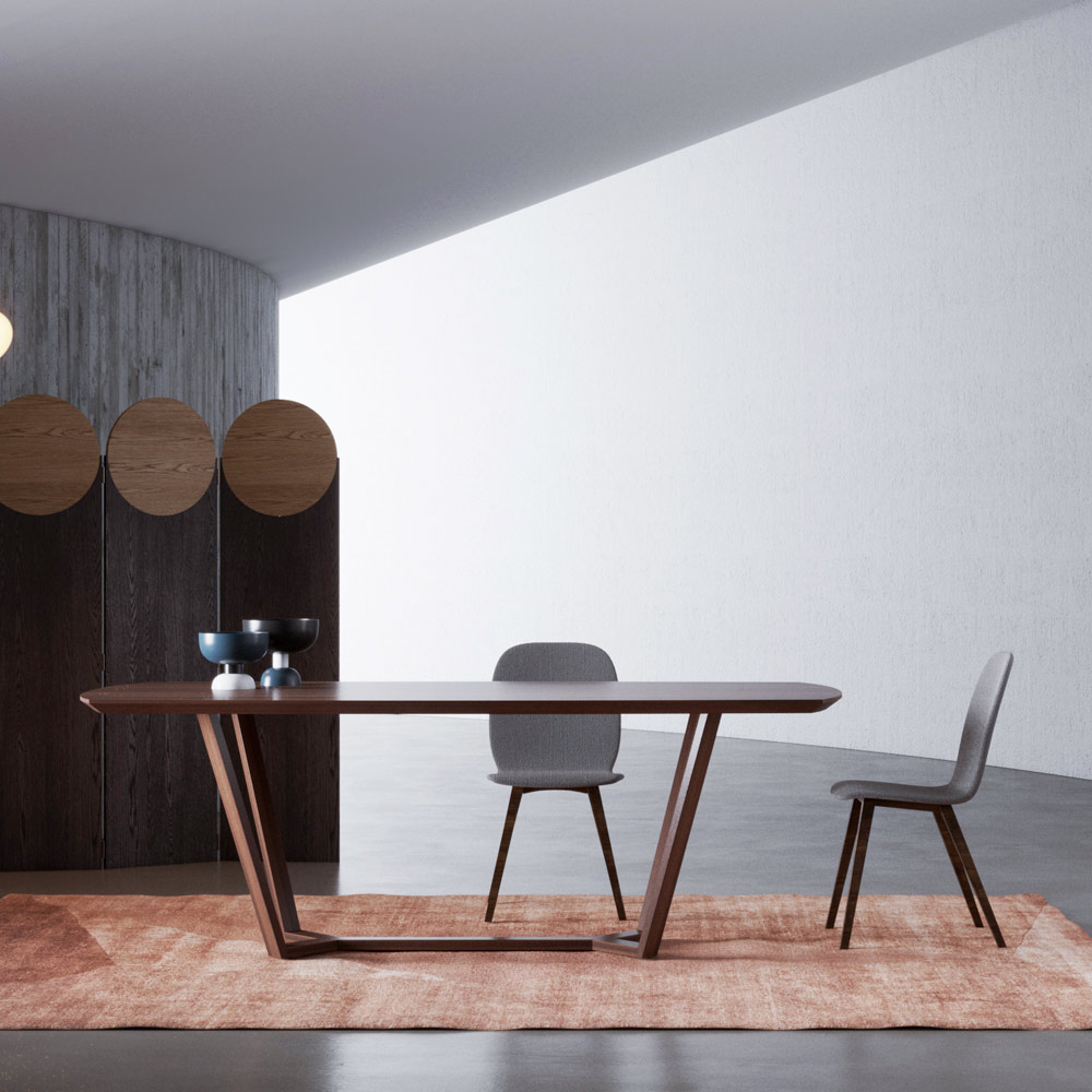 Pevný stůl se zkosenou tvarovanou deskou a podnoží z masivního dřeva Made in Italy.